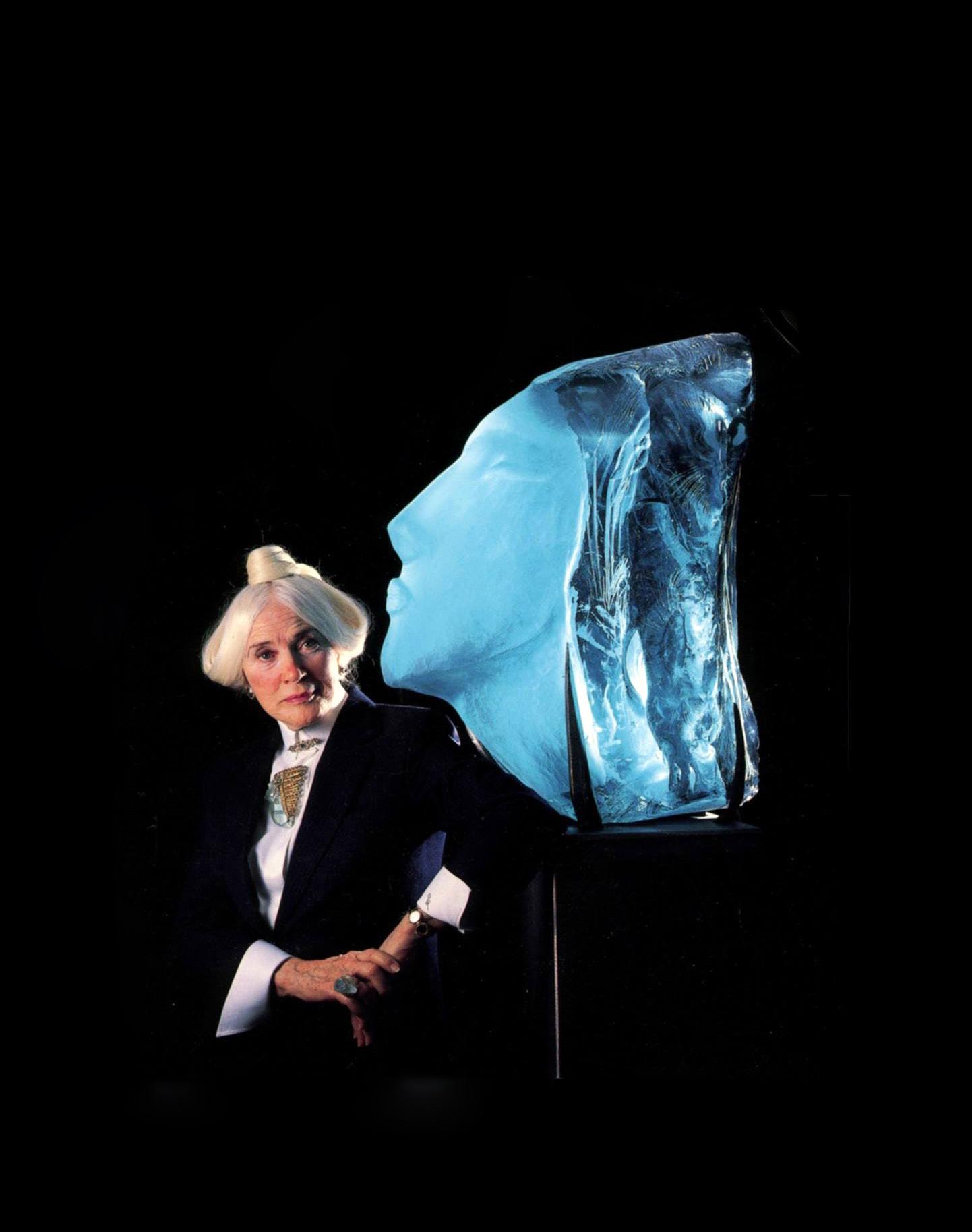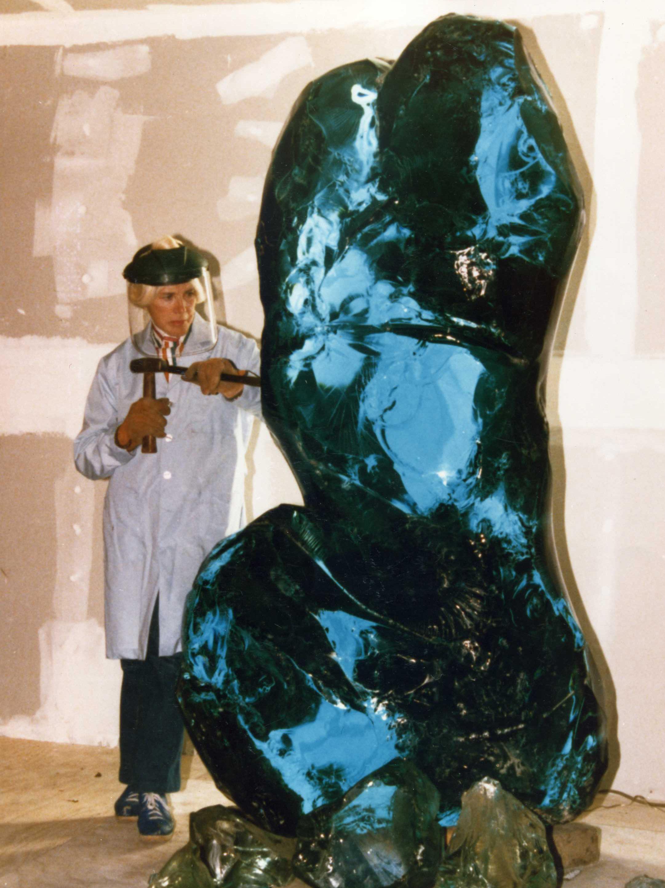 In the 1960’s Pascal discovered an abandoned glass foundry in Dunbar, Pennsylvania containing tons of exquisite glass boulders which had been tempered in such a way that she was able to carve the glass with a hammer and chisel, and thus a new medium was born.