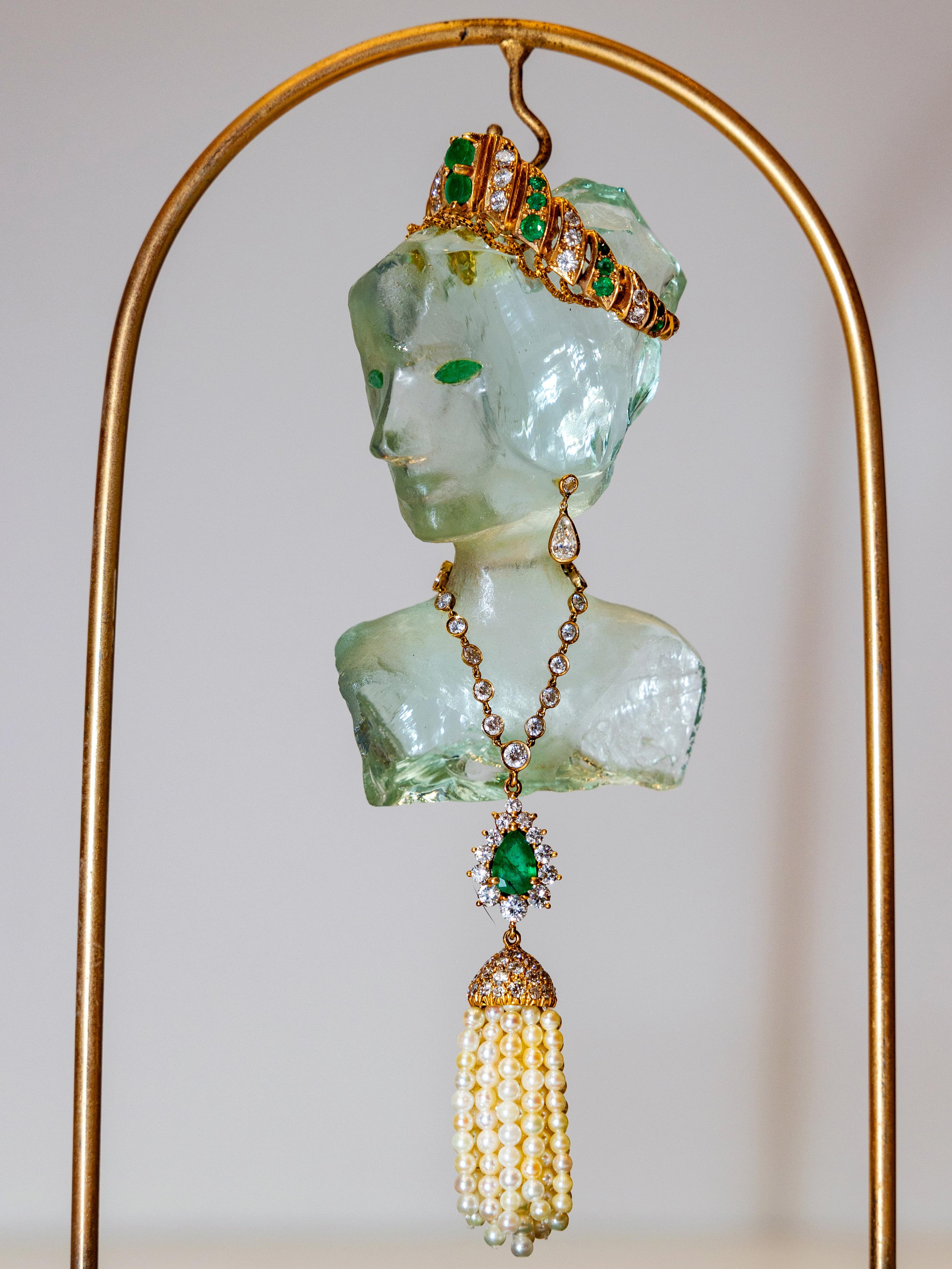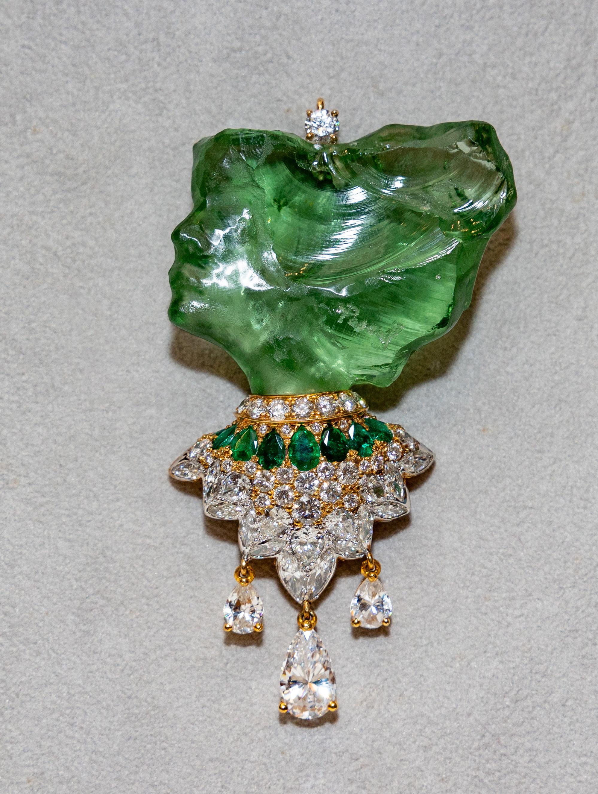 Green Swarovski crystal mounted in 14k gold and inlaid with 53 diamonds and emeralds.