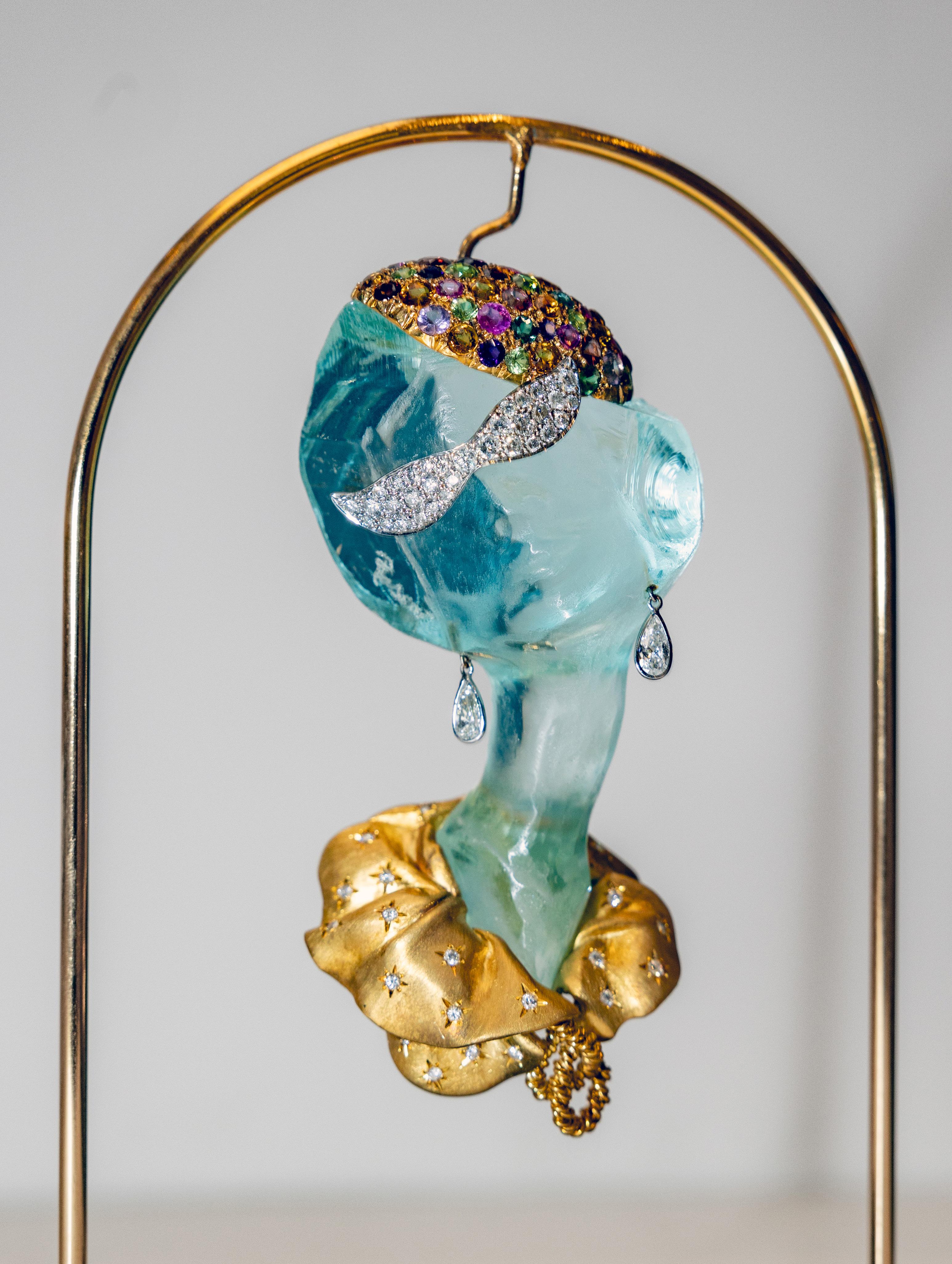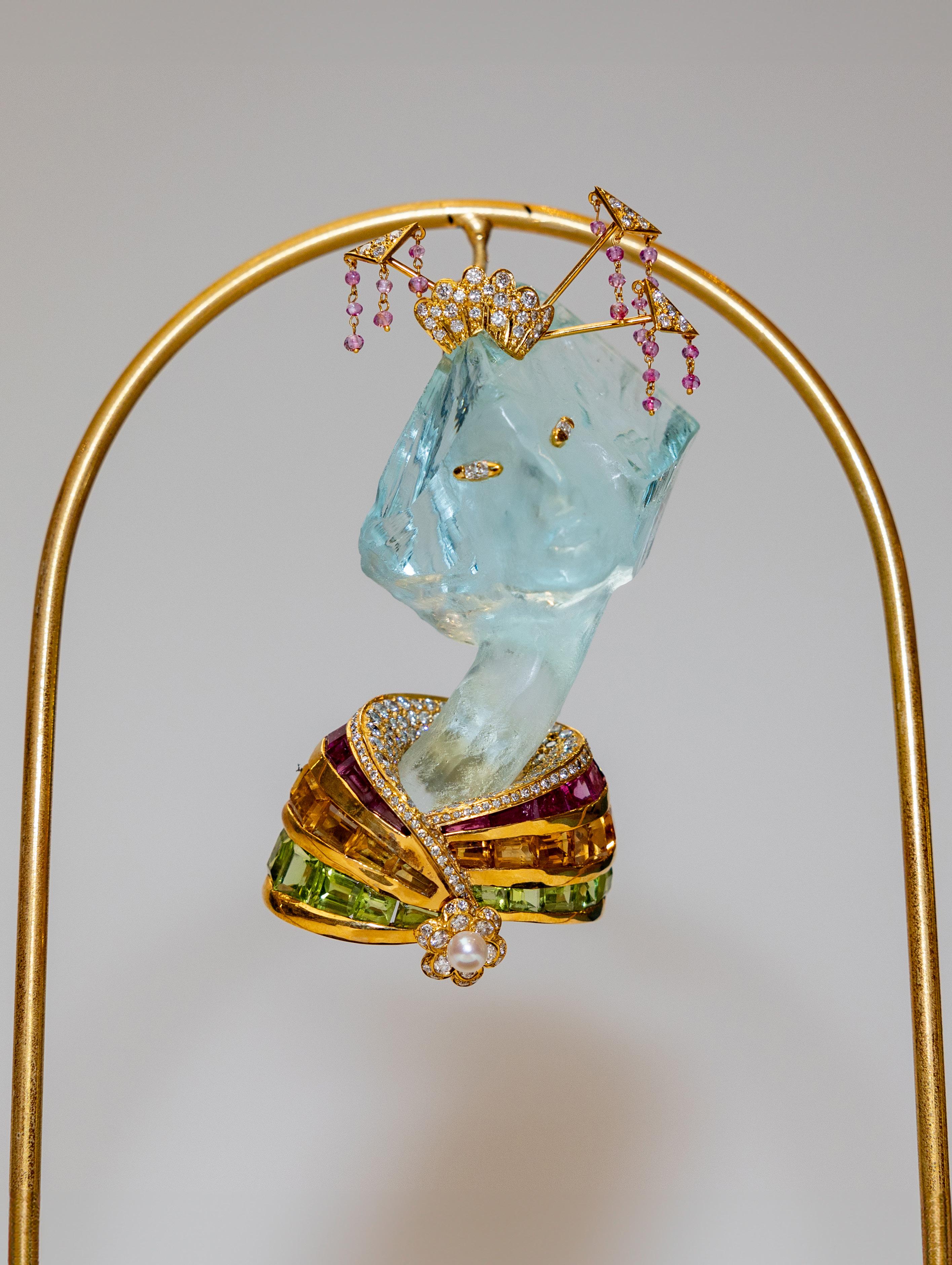 Aquamarine glass mounted in 14k gold and set with 77 diamonds and precious stones.