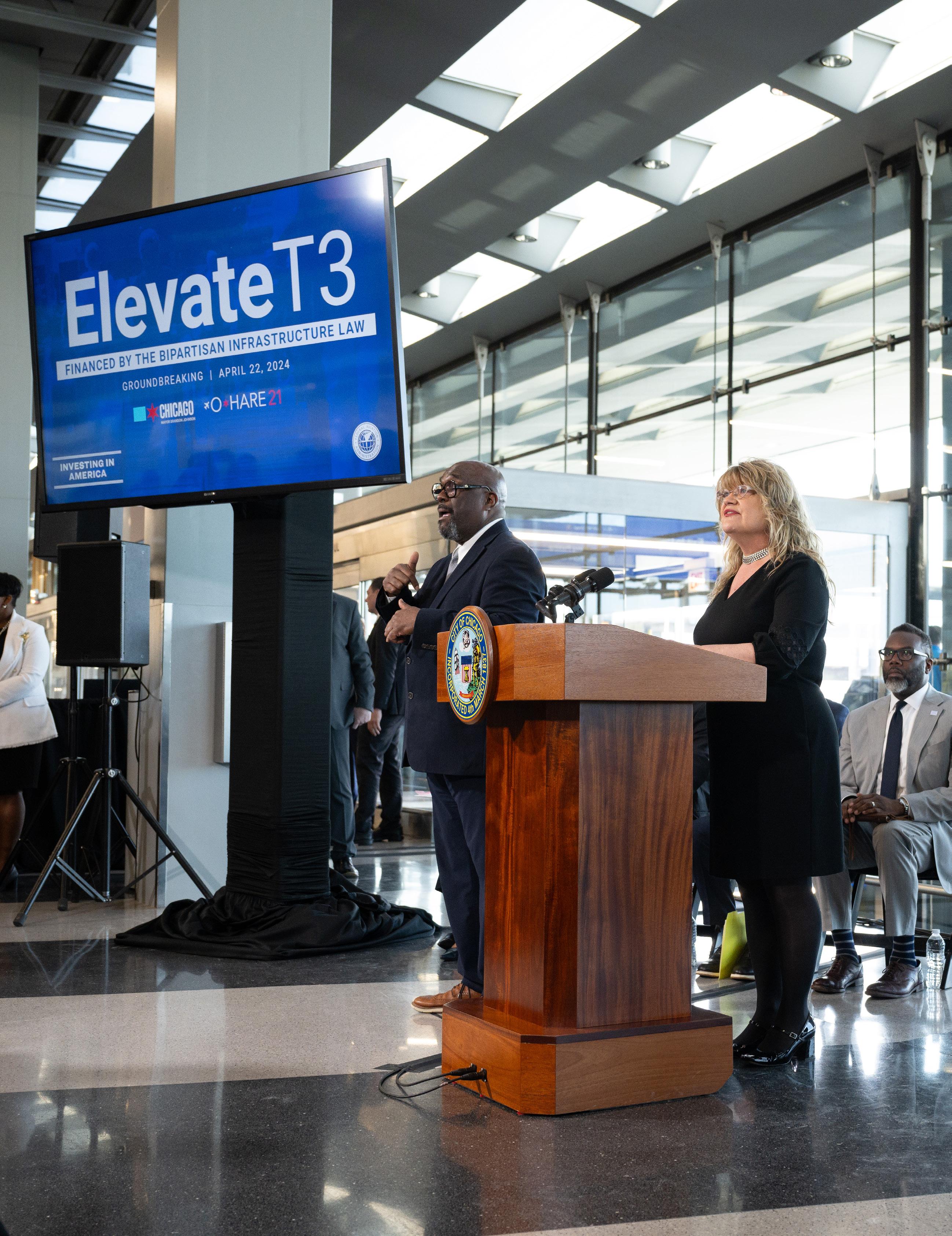 Mayor Johnson, Senators Dick Durbin and Tammy Duckworth, Congressman Jesus Garcia and airline partners break ground on the $300 million ElevateT3 project, a major expansion and reconfiguration of Terminal 3. The terminal—built in 1962 and renovated in the 1980s— receives expanded passenger corridors and holdroom spaces; a reconfigured and upgraded baggage handling system; reconfigured Transportation Security Administration checkpoints; and approximately 10,000 square feet of new concessions and amenity spaces.