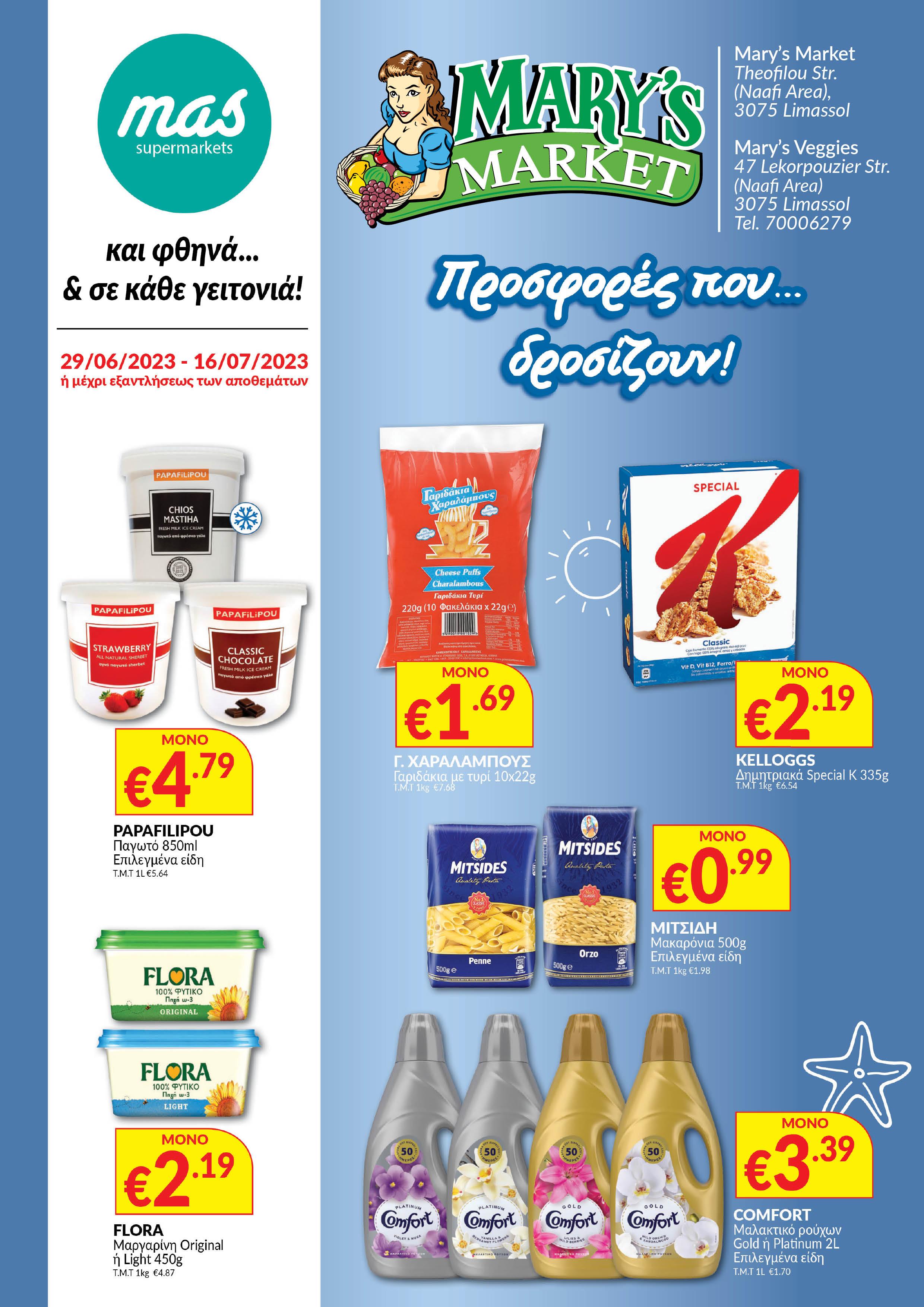 Οι προσφορές του φυλλαδίου ισχύουν μόνο στην Υπεραγορά mas που το όνομα της αναγράφεται στο εξώφυλλο. Η ένδειξη “σε επιλεγμένα είδη” εννοεί τα είδη που διαθέτει η υπεραγορά που αναφέρεται το όνομα της στο εξώφυλλο. * Τ.Μ.Τ: Τελική μοναδιαία τιμή supermarkets €3.29 € 3.89 ΥΠΕΡ-ΠΡΟΣΦΟΡΑ MR. GRAND Ρολό κουζίνας decor 72m Τ.Μ.Τ 1m €0.05 €1.75 € 2.09 ΥΠΕΡ-ΠΡΟΣΦΟΡΑ MR. GRAND Τονοσαλάτα καλαμπόκι ή μεξικάνα 160g Τ.Μ.Τ 1kg €10.94 €1.49 € 1.79 ΥΠΕΡ-ΠΡΟΣΦΟΡΑ MAS BEST BRAND Χαρτοπετσέτες 1Ply 33x33cm 140 τεμάχια Τ.Μ.Τ 1 τεμάχιο €0.01 €4.09 € 4.99 ΥΠΕΡ-ΠΡΟΣΦΟΡΑ MAS BEST BRAND Χαρτί υγείας 3Ply 218.4m Τ.Μ.Τ 1m €0.02 €2.99 € 3.69 ΥΠΕΡ-ΠΡΟΣΦΟΡΑ MR. GRAND Καλαμπόκι 1kg €2.49 € 2.99 ΥΠΕΡ-ΠΡΟΣΦΟΡΑ MR. GRAND Λαχανικά ανάμικτα ή αρακάς 1kg €1.35