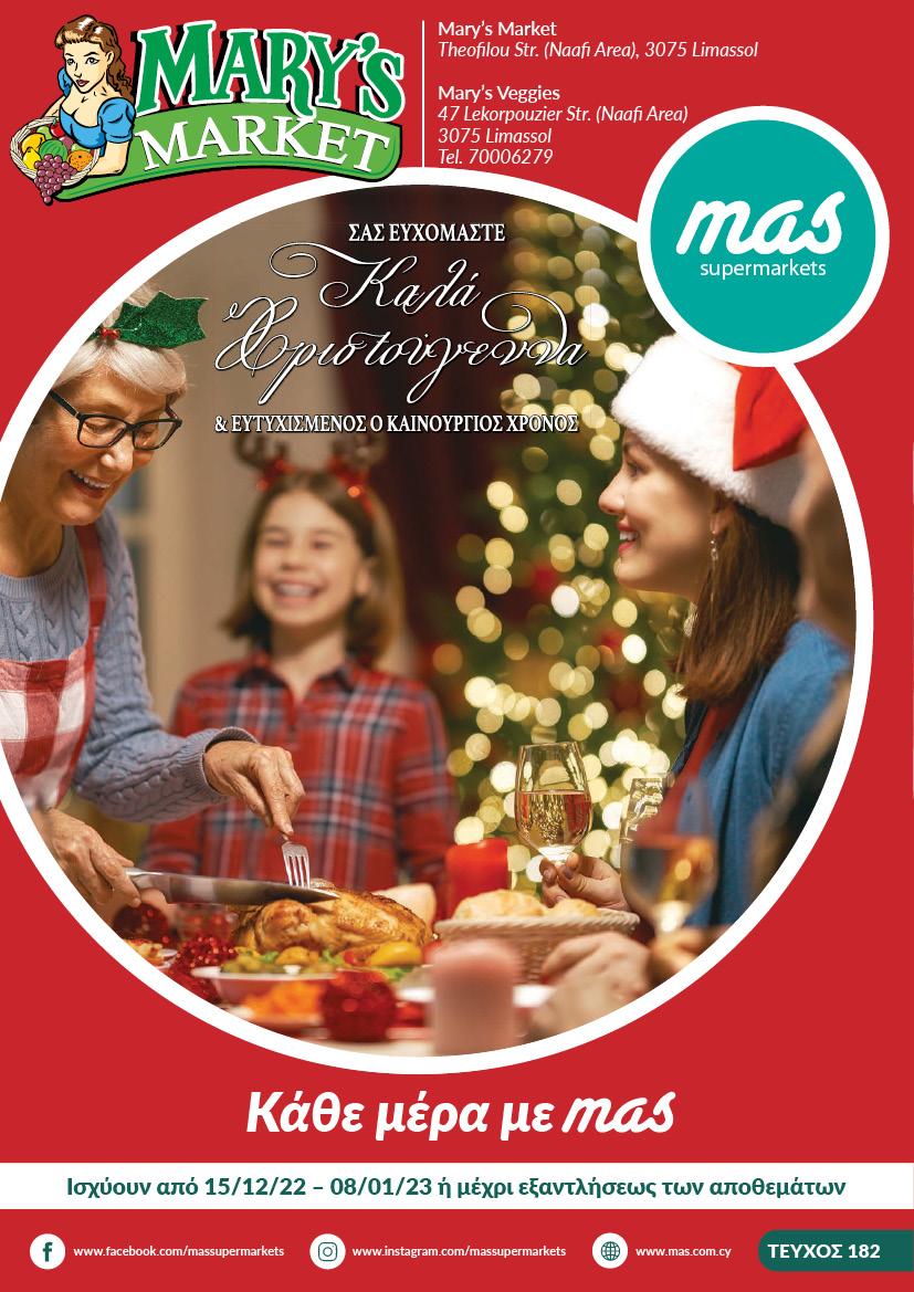Οι προσφορές ισχύουν με αγορές €35 και άνω, με όριο 2 συσκευασίες ανά είδος ανά επίσκεψη ημερησίως. Η Υπεραγορά δεν φέρει καμία ευθύνη για τυπογραφικά λάθη και παραλήψεις. Οι προσφορές του φυλλαδίου ισχύουν μόνο στην Υπεραγορά mas που το όνομα της αναγράφεται στο εξώφυλλο. Η ένδειξη “σε όλα τα είδη” εννοεί τα είδη που διαθέτει η υπεραγορά που αναφέρεται το όνομα της στο εξώφυλλο. * Τ.Μ.Τ: Τελική μοναδιαία τιμή Κ. Γραφεία: Βιομ. Περιοχή Ιδαλίου Ερμού, 13 Α Τ.Θ. 17022, Λατσιά, Λευκωσία, Τηλ: 22015959 , email: info@mas.com.cy ΧΟΡΗΓΟΙ για όλους ΠΑΓΚΥΠΡΙΟΣ ΣΥΝ∆ΕΣΜΟΣ ΓΙΑ ΠΑΙ∆ΙΑ ΜΕ ΚΑΡΚΙΝΟ ΚΑΙ ΣΥΝΑΦΕΙΣ ΠΑΘΗΣΕΙΣ Ενώστε την αγάπη σας με τη δική mas! Από 1η Νοεμβρίου μέχρι και τέλος Δεκεμβρίου 200 κουμπαράδες σε 50 Υπεραγορές Mas Παγκύπρια περιμένουν το δικό σας και το δικό Mas δώρο που θα κάνει αυτά τα Χριστούγεννα πιο ανθρώπινα …. Για Όλους Mas! ΣΤΑ ΠΛΑΙΣΙΑ ΤΗΣ ΚΟΙΝΩΝΙΚΗΣ ΕΥΘΥΝΗΣ ΤΩΝ ΥΠΕΡΑΓΟΡΩΝ ΜΑΣ SOS το παραμύθι μας Οι Υπεραγορές MAS, δημιούργησαν το παραμύθι «SOS Η μαγείρισσα απεργεί» σε συνεργασία με τον συγγραφέα Χριστόφορο Χριστοφόρου, την διατροφολόγο Μαρί Τερέζ Φράντζιας και την εικονογράφο Χρύσω Σορόκκου. Το παραμύθι μπορείτε να το βρείτε σε όλα τα καταστήματα MAS Παγκύπρια. Όλα τα έσοδα θα δοθούν στο Ίδρυμα Άγιος Γεώργιος - Χριστάκη Χασάπη στη Λάρνακα. ΜΟΝΟ ΜΕ ΧΟΊΡΊΝΕΣ ΣΕΦΤΆΛΊΕΣ το κιλό ΧΟΊΡΊΝΟΣ ΚΊΜΆΣ το κιλό ΒΟΔΊΝΟ ΣΕ ΚΥΒΟΥΣ το κιλό ΒΟΔΊΝΟ ΜΕ ΚΟΚΆΛΟ το κιλό ΧΟΊΡΊΝΟ MAS BEST BRAND ΚΟΤΟΠΟΥΛΟ ΟΛΟΚΛΗΡΟ το κιλό €4.89 €4.29 €8.95 €6.49 €4.89 €3.39 €4.99 ΧΟΊΡΊΝΗ ΚΟΥΤΆΛΆ ΜΕ ΚΟΚΆΛΟ ΓΊΆ ΣΟΥΒΛΆ το κιλό MAS BEST BRAND ΦΊΛΕΤΟ ΚΟΤΟΠΟΥΛΟ το κιλό €6.89 Οι προσφορές ισχύουν 20/12/2022 - 24/12/2022 Οι προσφορές ισχύουν 27/12/2022 - 31/12/2022 Οι προσφορές ισχύουν 04/01/2023 - 08/01/2023 Οι προσφορές ισχύουν 15/12/2022 - 08/01/2023 €3.49 ΦΡΕΣΚΟ ΆΡΝΊ ΡΊΦΊ το κιλό Γαλοπούλα Φρέσκια το κιλό €5.89 ΥΠΕΡ-ΠΡΟΣΦΟΡΆ MAS BEST BRAND ΜΗΡΟΊ ΚΟΤΟΠΟΥΛΟ το κιλό