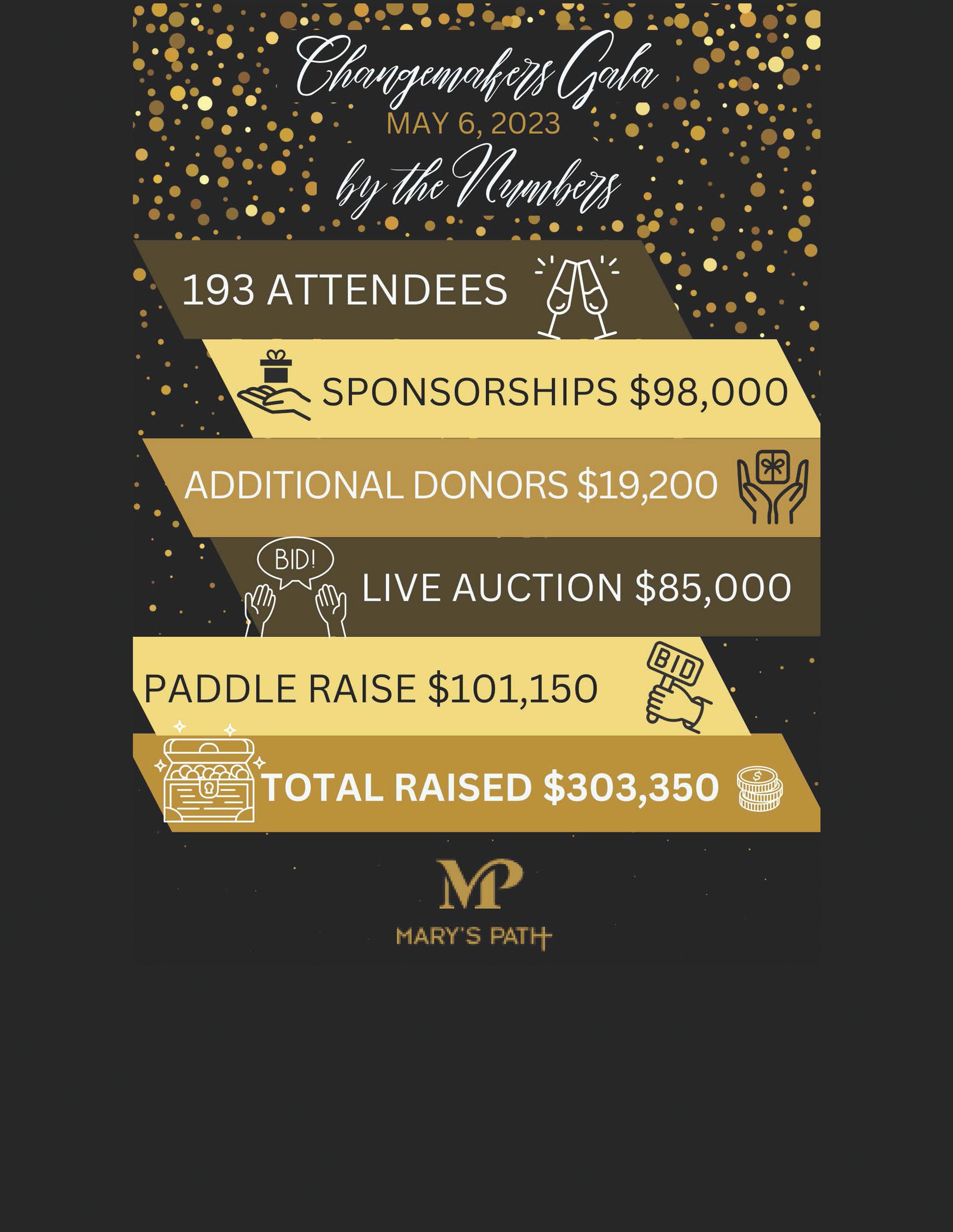 Mary’s Path thanks the Gala Committee, our Board of Directors and Advisory Council Members, event volunteers and sponsors, auction item donors, and individual attendees for contributing to the success of the Changemakers Gala.