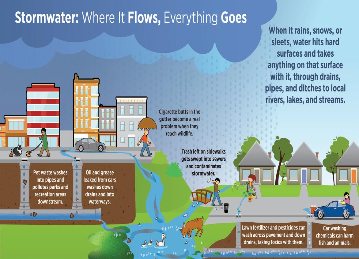 Known as stormwater, once rain or snow hits the ground, it can pick up dirt, chemicals, and other pollutants and carry them downstream from your sidewalks, streets, and alleys to bodies of water in your community. Here are just a few steps you can take to be stormwater smart, starting in your own neighborhood: