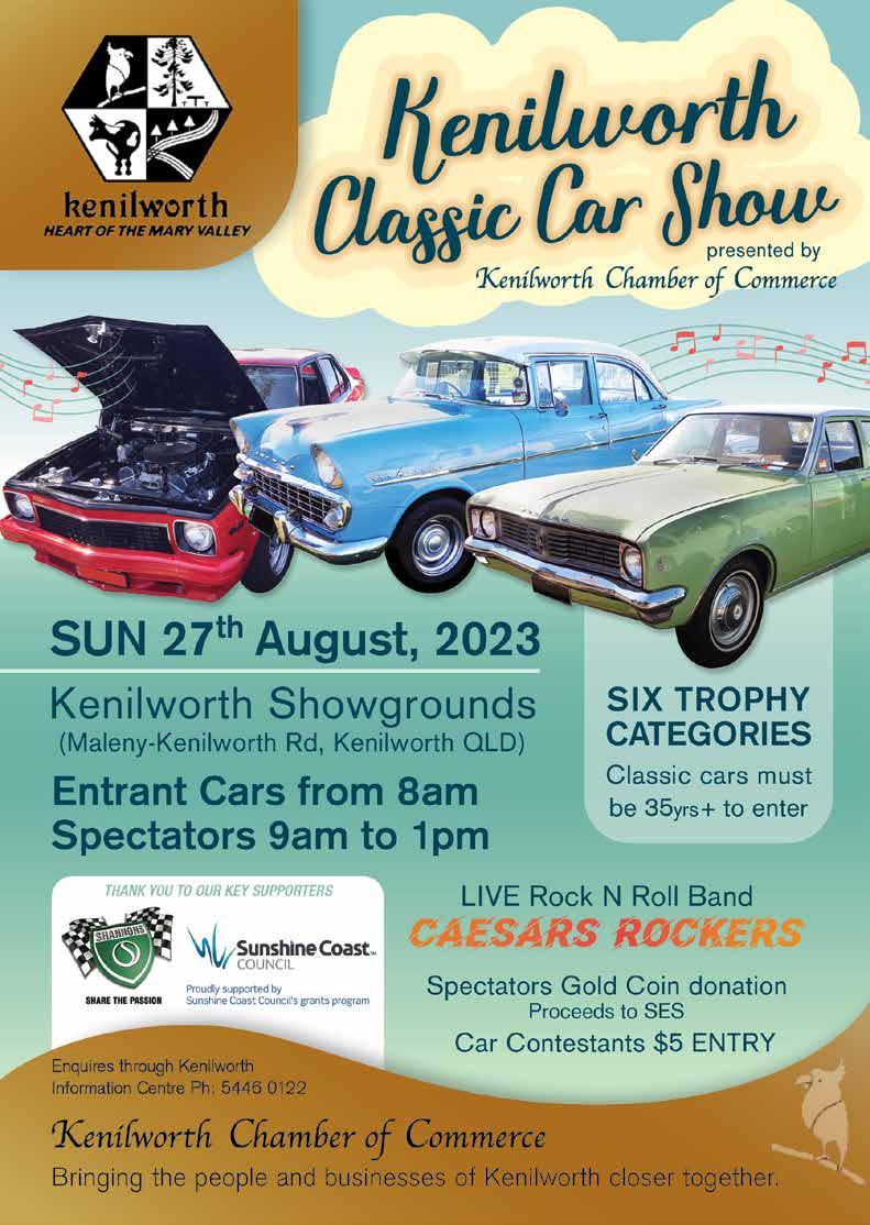 Since our inaugural Classic Car Show was such a huge success it was decided to hold the show annually as the chambers flag ship event. Our aims are to promote our town of Kenilworth, promote local businesses, get the community working together as a unit, promote and obtain gold coin donations for the local SES branch, promote and obtain gold coin donations for the local Kenilworth Community College, promote our Chamber and thereby increase both interest and membership.