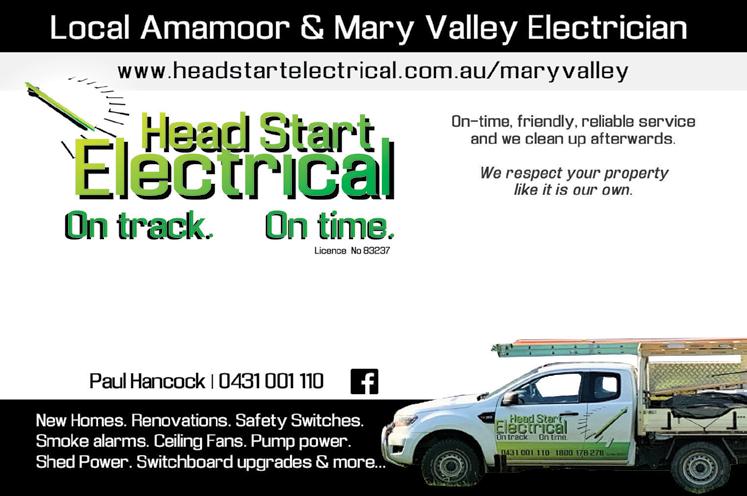 THANK YOU TO OUR ADVERTISERS The Mary Valley Voice 15 MARCH 2023 | 3 LANTANA CONTROL & PADDOCK MULCHING ...woody weeds removed by the roots then mulched! Reducing lantana regrowth and herbicide use. Light footprint 65 HP tractor. CONTACT FORESTFARMER 0754 944 746 OR 0418 786 143 THE MARY VALLEY VOICE © 2023 “Is your switchboard, Generator ready? Call us to find out!” Local Office 5358 6800 Over 30 years’ experience in the industry Proudly supporting local Mary Valley publications.
