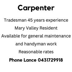 6 |15 MARCH 2023 The Mary Valley Voice CATERING FOR ALL ASPECTS OF TREE WORKS 0458 659 710 Servicing the Sunshine Coast and Hinterland Gympie and surrounding areas QUALIFIED ARBORIST Fully Insured – Free Quotes Stump Grinding – Cherry Picker Hire Earthworks – Email bushandbeachtrees�live.com.au www.bushandbeachtreeservices.com.au THE MARY VALLEY VOICE © JULY 2019 GREEN EARTHWORX We don’t do average. D6H and D6 winch Dozer 22T and 1.5T Excavators Posi Track Bobcat Crane Truck with Tipper 100hp Tractor Slasher Logging, Tree Felling, Firewood MARY VALLEY VOICE © 2015 Servicing the Hinterland. Lisa & Ray Green 0457 336 122 • 0487 549 250 greenearthworx@bigpond.com Solicitors visiting Kenilworth Thursday afternoons by appoinment only 5447 3122 e: admin@cartlaw.com.au CARTWRIGHTS Lawyers • • • • UNDER & OVER ELECTRICAL Are your powerlines safe enough? • Supply & install either underground or overhead powerlines • Maintenance checks on existing lines • Free quotes Martin 0412 321 197 email: under.over@bigpond.com Licence # 69449 Storage EUMUNDI Clean • Secure • Self-lockable units Free pickup (conditions apply) PHONE 5442 8627 MARY VALLEY BUSINESSES Slashing | Light Scrub Clearing 4WD tractor, 6ft slasher, 8ft stickrake Call Jos Wilson 0407 944 563 THE MARY VALLEY VOICE © OCT 2021 Ph Tim to discuss work needed. www.bundesenfamilybuilders.com.au CALL ZAK - RELIABLE ELECTRICIAN 25 YEARS SWITCHBOARDS UPGRADES, SAFETY SWITCHES. UNDERGROUND POWER - SHED, CABIN, STUDIO Fans, LED Lights, Outdoor Lights, Power. Energy Saving Solutions, Security Lights. Photo Smoke Alarms, SOLAR Service. Lic 72787 RV ELECTRICAL 0413 885 504 eastonlawyers your local lawyers 62 Maple Street, Maleny | T 5494 3511 6B/3 Obi Obi Road, Mapleton | T 5478 6500 P.O. Box 255 Maleny Qld 4552 | F 5494 2477 Wishing all our valued customers a safe and happy Christmas your local lawyers 62 Maple Street, Maleny | T 5494 3511 PO Box 255 Maleny Q 4552 | F 5494 2477 MARY VALLEY MILK Servicing the local area for over 40 years. Avail. 7 days a week maryvalleymilk@bigpond.com We supply molasses for rural delivery. All areas. Kenilworth, Brooloo, Moy Pocket, Belli Park, Obi Obi, Coolabine, Kidaman Creek, Little Yabba, Conondale. DRINKING WATER 5446 0736 DOMESTIC WATER 11,000 LITRES Lic No. DWC14/0021 KENILWORTH Plumbing & Gas 0477 017 976 • Hot Water Units Electric / Gas • Q.B.S.A. # 040206 kenilworthplumbingandgas@gmail.com THE MARY VALLEY VOICE © 2022 WANTED TRACTOR AND SMALL DOZER. SMALL EXCAVATOR ALSO! Ph 0407 712 302