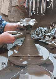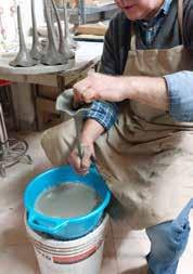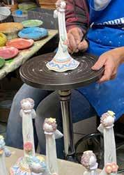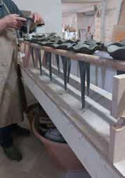 Il corpo embrionale si realizza con l’antichissima tecnica al tornio (foto1) e dopo una breve essiccazione si esegue con particolare destrezza l’allungamento dell’argilla per affusolare il corpo (foto2); quindi i semilavorati vengono appesi per continuare l’essicca zione (foto3) ed in seguito si applicano gli elementi che costituiscono la figura.