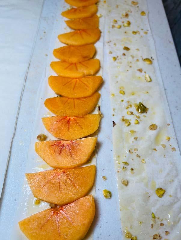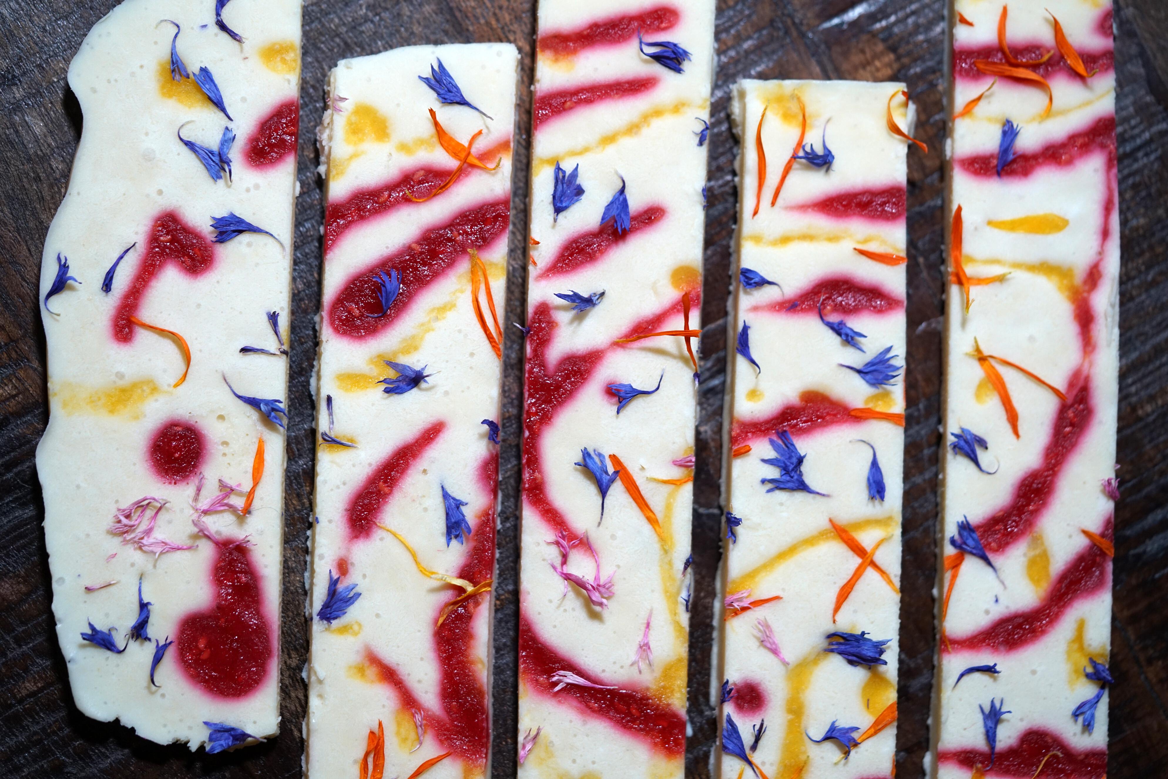 Drain the water from the cashews and apricots. Put the passion fruit juice, honey, 1/2 cup of the cashews and all of the apricots into the food processor . Blend well, then press the smooth mixture out onto parchment paper on a baking pan.