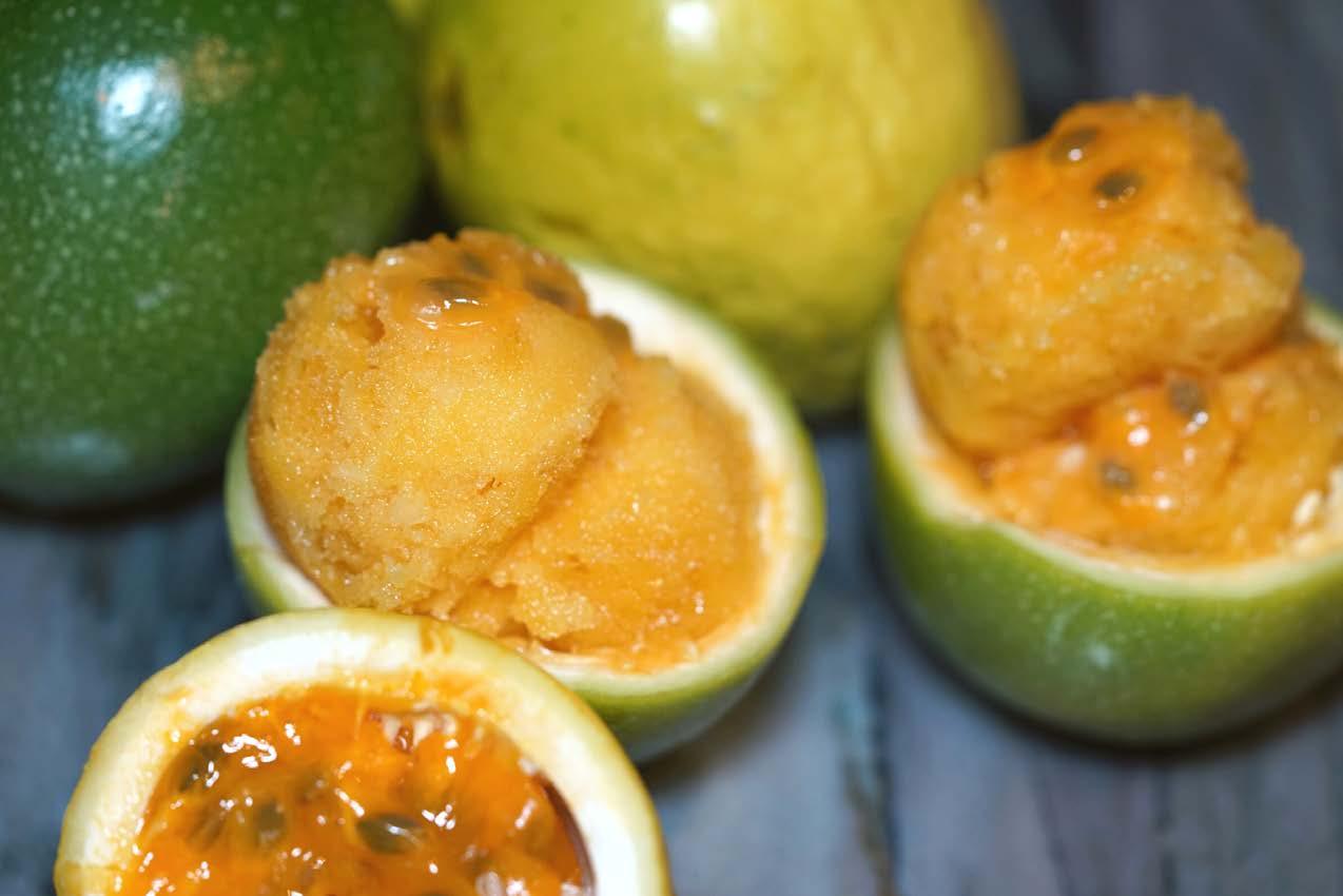 Once the mixture has hardened, remove from the freezer and use an ice cream scooper to serve the sorbet. Sorbet scoops can be served in dessert bowls or in passion fruit husks. Use passion fruit jam to garnish the presentation.