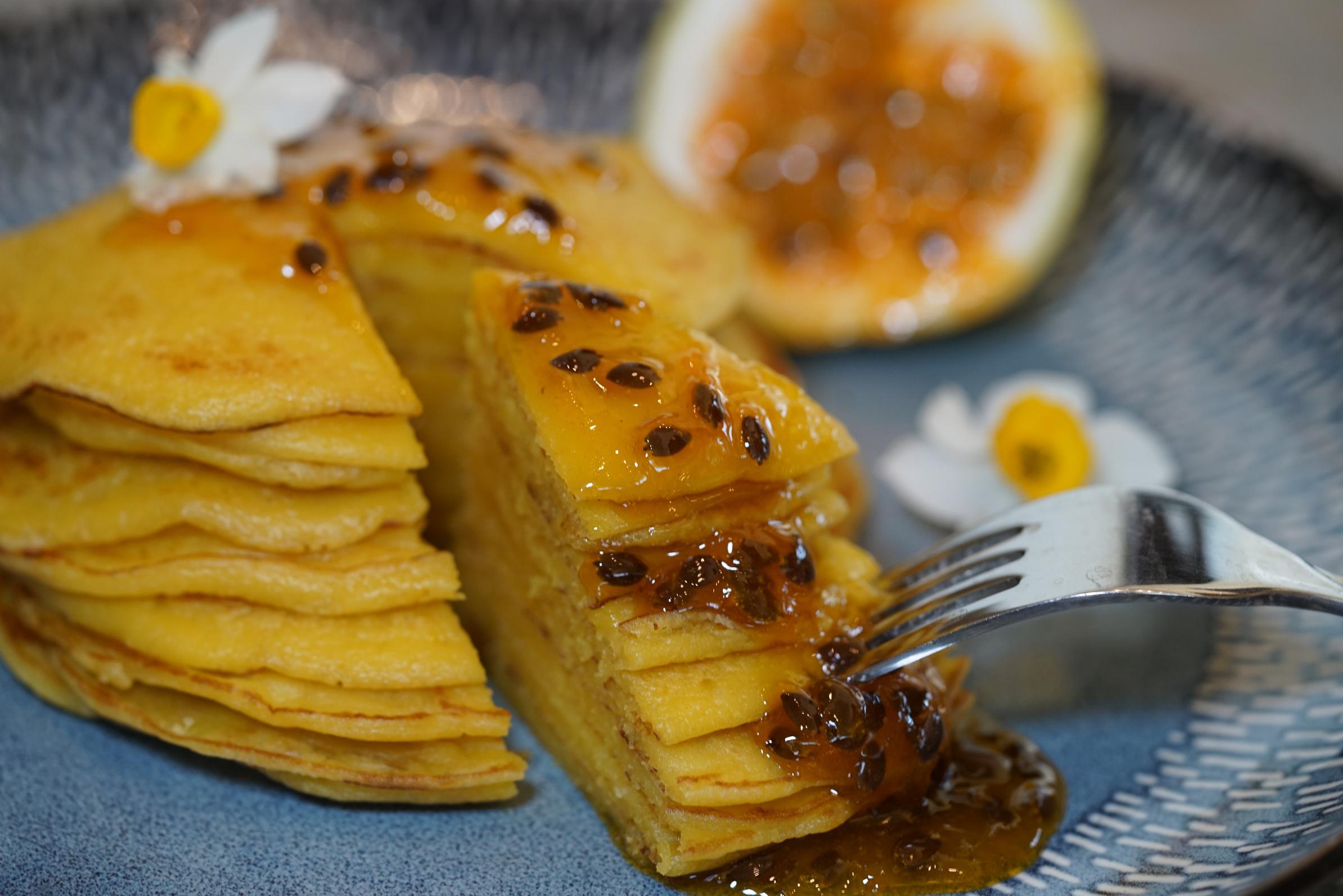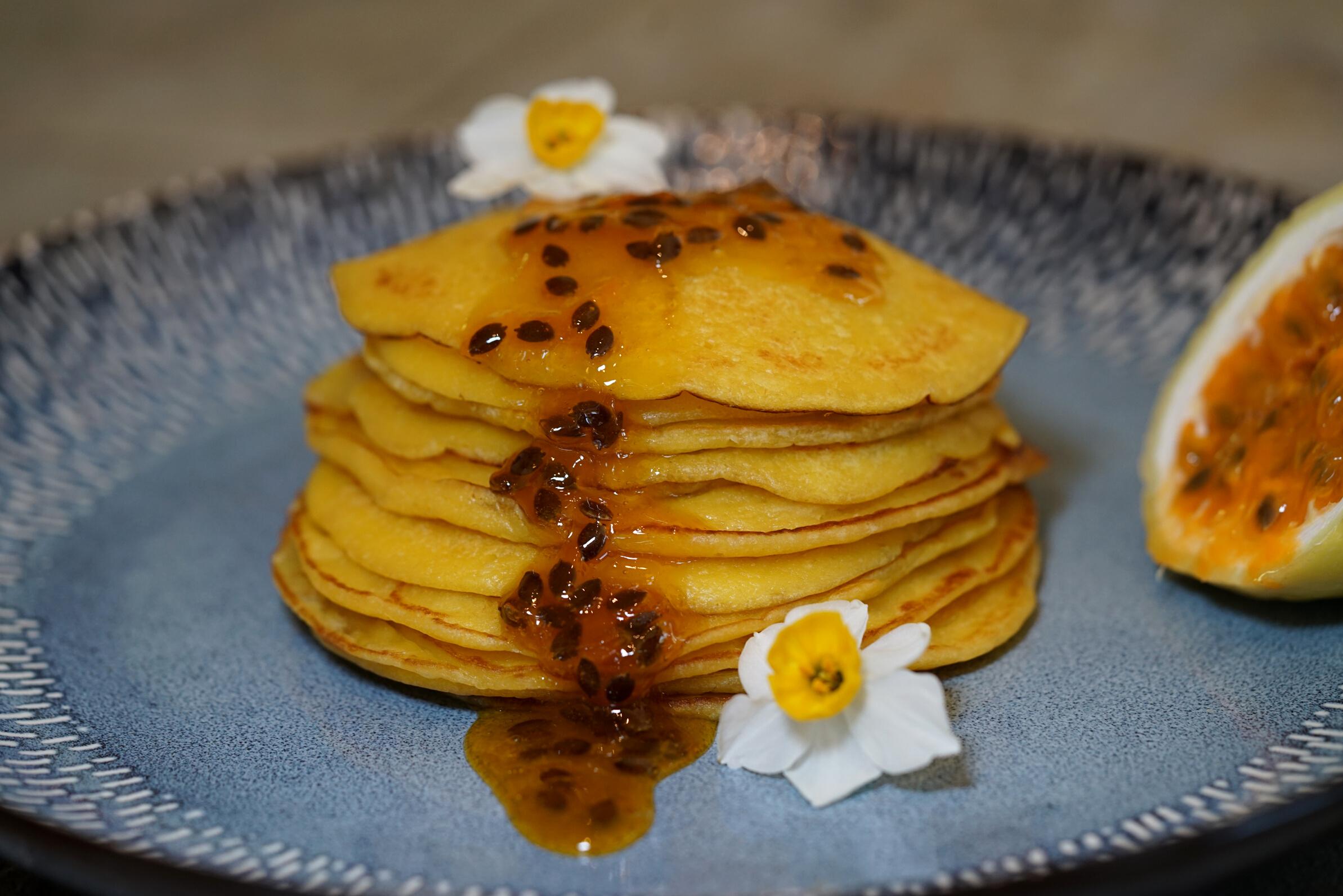 Mixallwetingredientstogether,then whiskindryingredients.Spoonbatter ontoahot,non-stickgriddleorskillet, cookingforapproximatelyoneminute oneachside(oruntilbubblesformon theedgesonthefirstside).Serve pancakeswithpassionfruitjamor passionfruithoney.