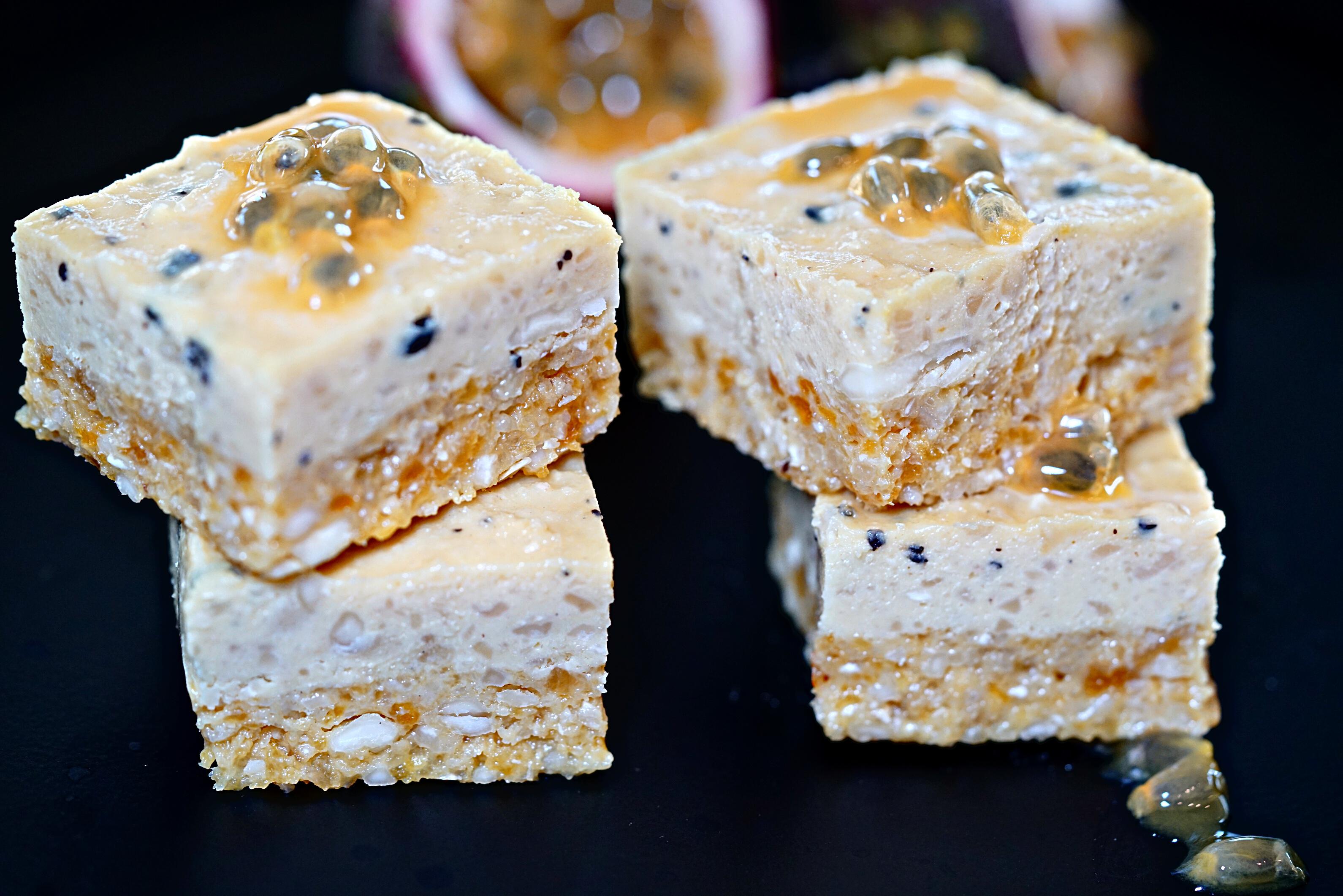 Put the top layer ingredients into the food processor: the remaining cashews, coconut butter, coconut oil, passion fruit pulp and salt. Pulse the food processor a few times until all is well combined.