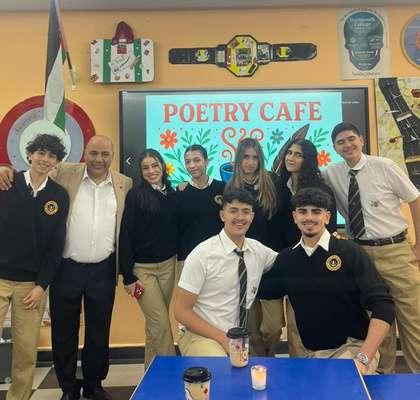As the new leaders of Poetry Café, we, Loren Shawabkeh and Fatima Al Sabah, were excited to welcome students back this year in Mr. Mamoun's class. The room became a cozy café, with Uncle Osaka coffee, candles, and treats like cookies and brownies.