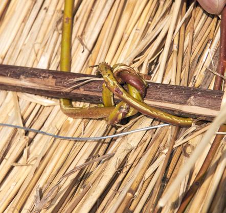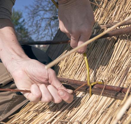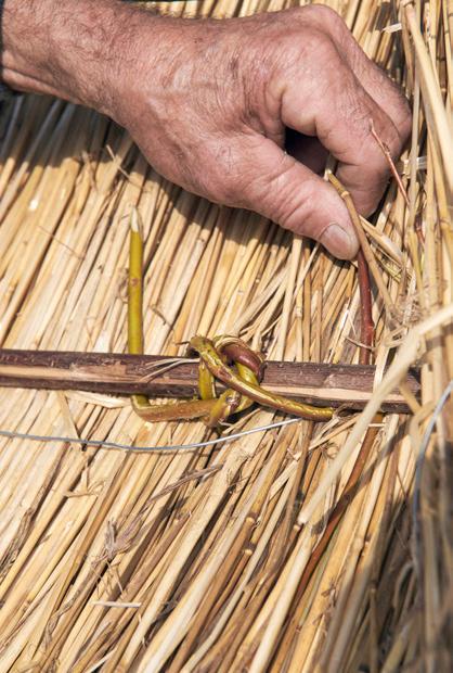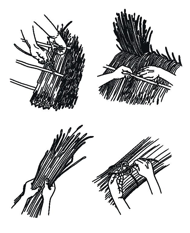 Ko snope razporedimo, jih odvežemo, da se vejice razporedijo enakomerno, nato pa jih dodatno pričvrstimo ob konstrukcijo.