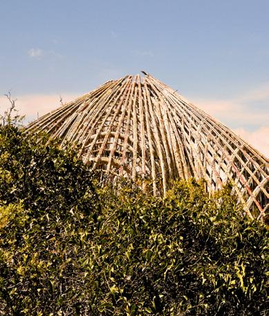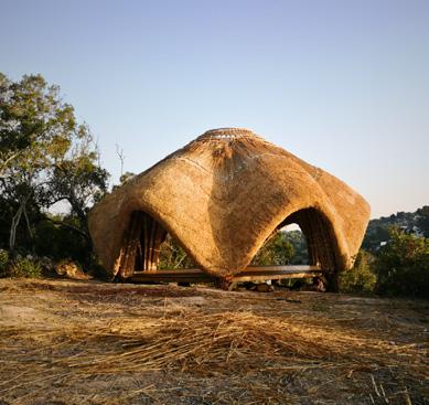 »Podkonstrukcija je bila v sklopu delavnice LearnBi0n postavljena iz trsa, streha je bila narejena s postopkom šivanja s slamo. Izziv projekta je bilo pokriti kupolasto strukturo, saj je slama, ki je sicer idealen material za pokrivanje konstrukcij iz trsa, omejena glede na oblikovne zmožnosti. Naklon strehe mora biti okoli 45 stopinj, nikakor pa ne manj kot 35 stopinj. Slednje je narekovalo način pokrivanja in botrovalo odprtosti strehe v sredini objekta.«