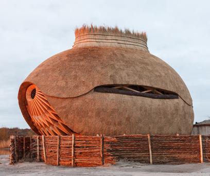 »Mother Pavilion je zasnovan na literarni predlogi, ki obeležuje zdravilno moč krajine v okoliški regiji. Forma izhaja iz nekdanjih sušilnic za slamo. Les je bil uporabljen iz lastnih gozdov, streha in fasade pa so iz slame, ki je bila požeta in omlatena na lokaciji.«