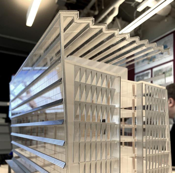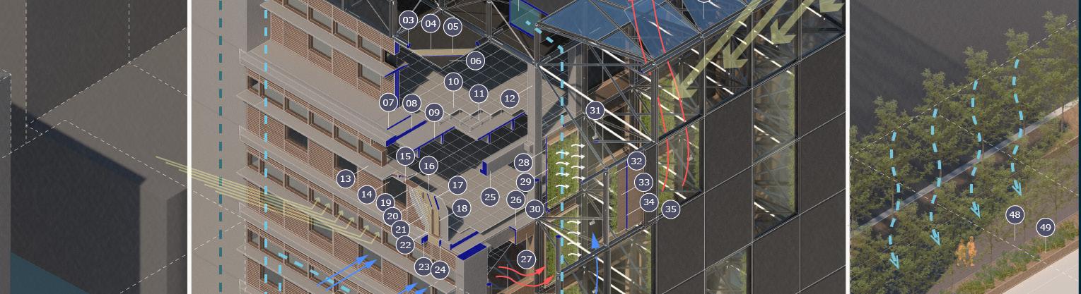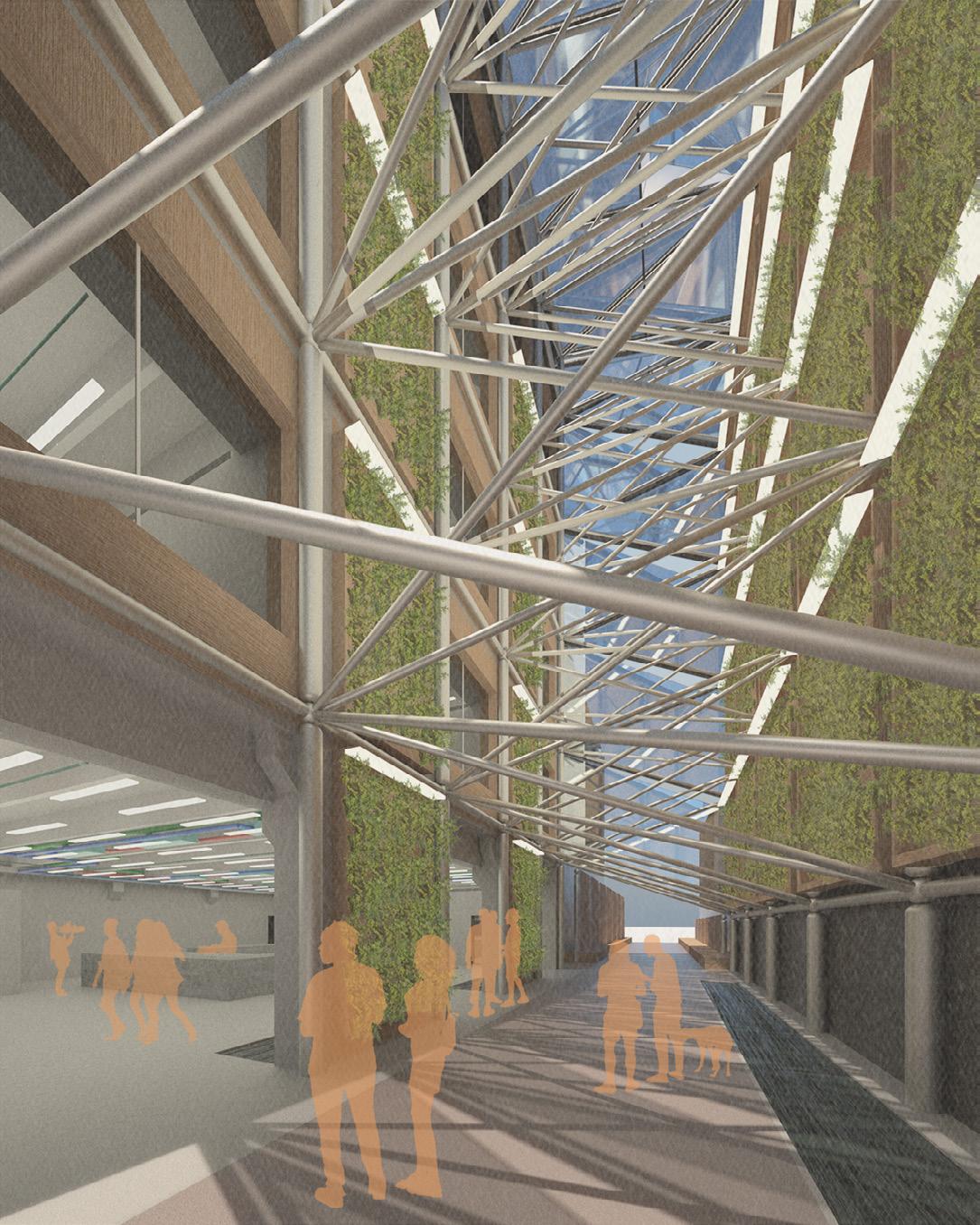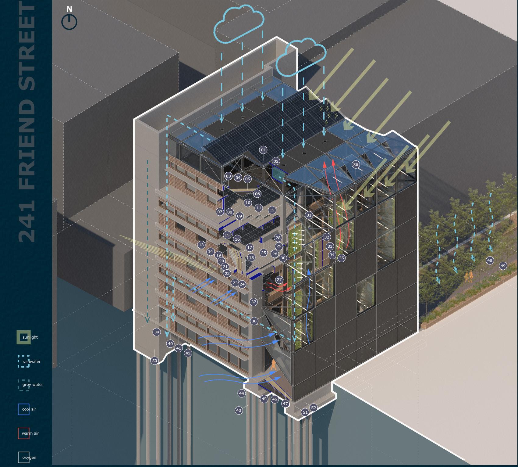 The brief for the final year of the undergraduate program at Northeastern was to design a building with a life expectancy of 100 years. This was done in tandem with a building systems course, and the expectation was to create a project that would provide architectural and MEP flexibilty, along with targeting sustainability during its construction and operation. The site was located in the dense North End neighborhood of Boston, complicating any considerations towards daylighting. 241 Friend Street consists of double T precast concrete beams that are suspended between two cores. One conventional cast-in-place concrete core contains egress, elevators, and MEP shafts, while a steel truss acts as the second core which caters towards human needs such as daylight, greenery, and air circulation. Operable windows at the atrium and occupied floors allow for passive cooling and heating, and a rainwater fed interior green wall improves air quality. Passive systems are supplemented mechanically by an exhaust fan at the top of the atrium, with radiant floor heating and a chilled beam system in the body of the building for more extreme weather.