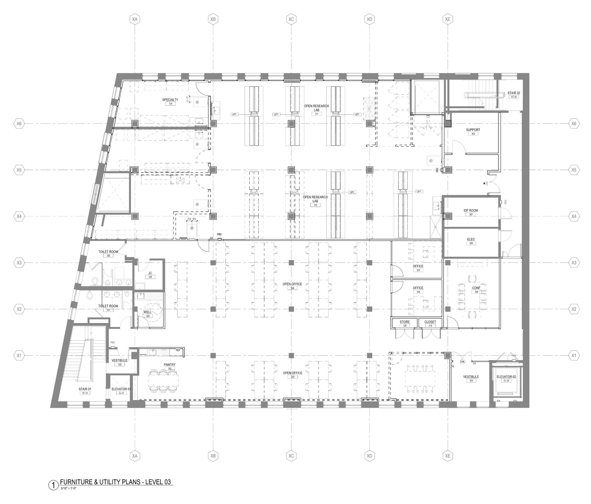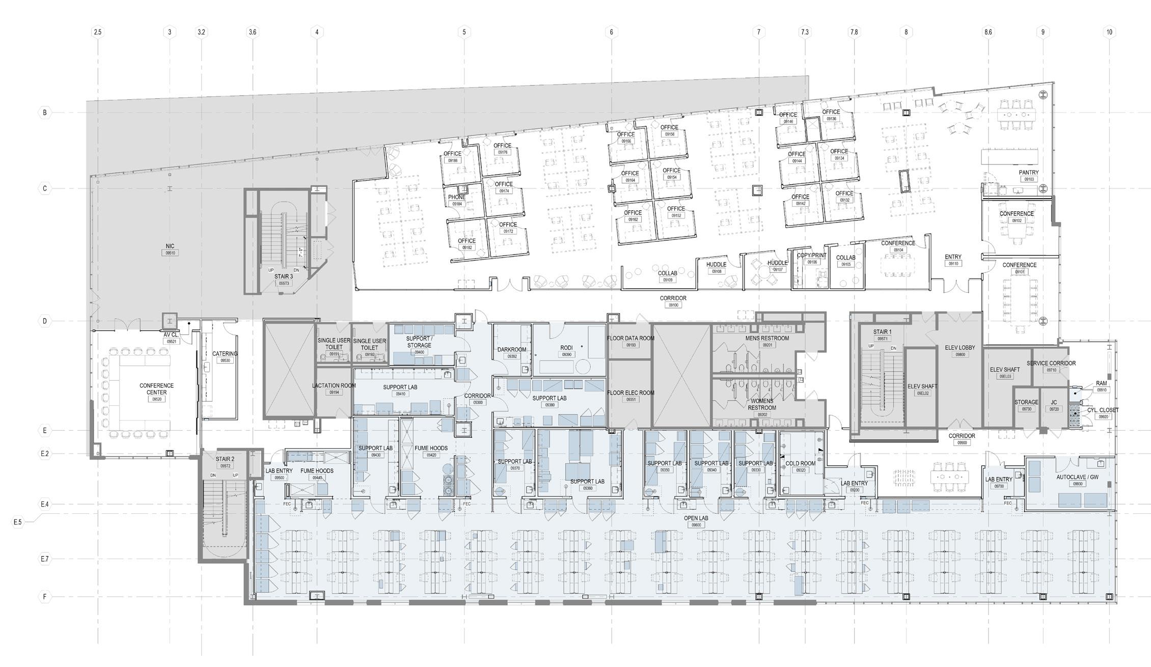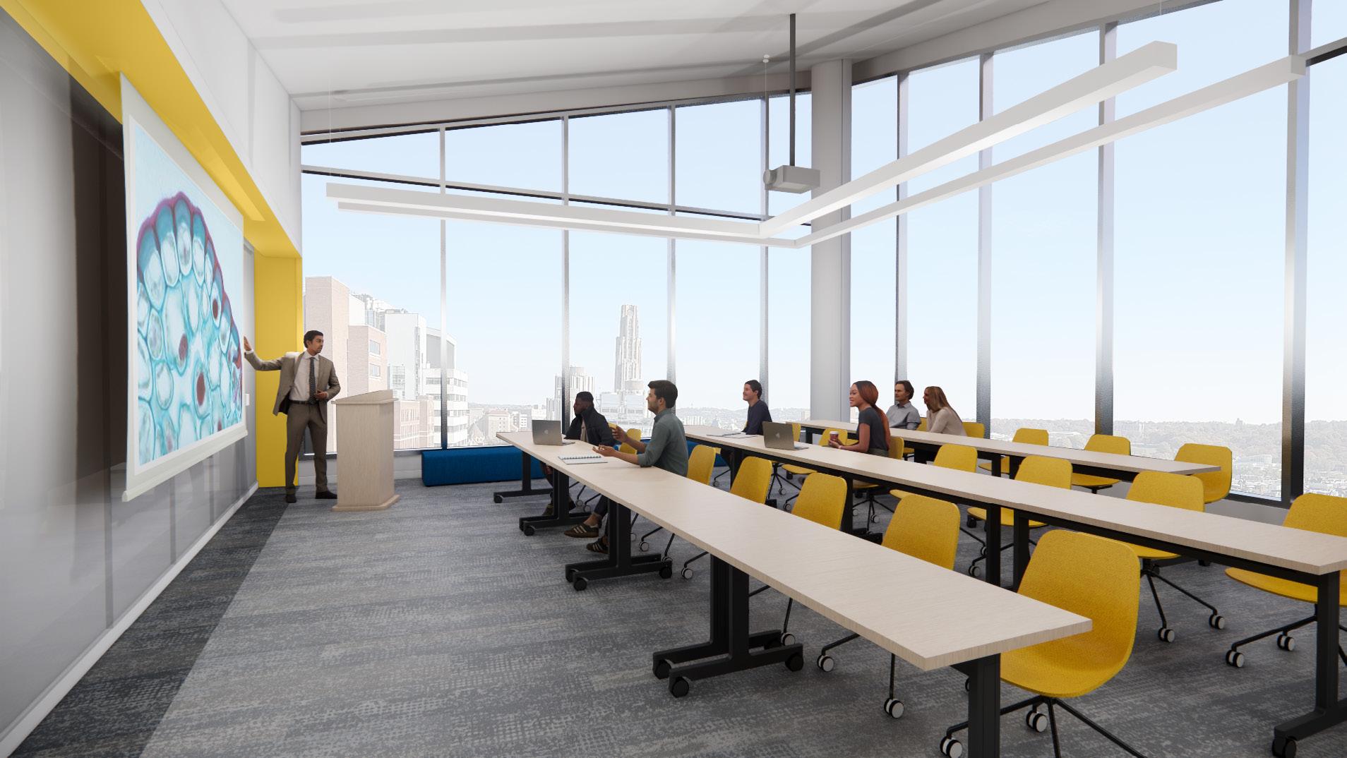 Fit-out of levels 09 and 10 in a new construction Core&Shell building purchased by the University of Pittsburgh School of Medicine. Program includes faculty & student office space, classrooms, conference rooms, cafe space, open lab and support spaces for the Department of Computational Science Biology on level 10, and swing lab space on level 9. The design process included multiple rounds of meetings with the University and the primary user group to create a space that caters to the evolving needs of higher education scientific research and teaching. Design was complicated by the Core&Shell layout, which was not intended for lab use. This project was done in cooperation with the Core&Shell architect, Strada.