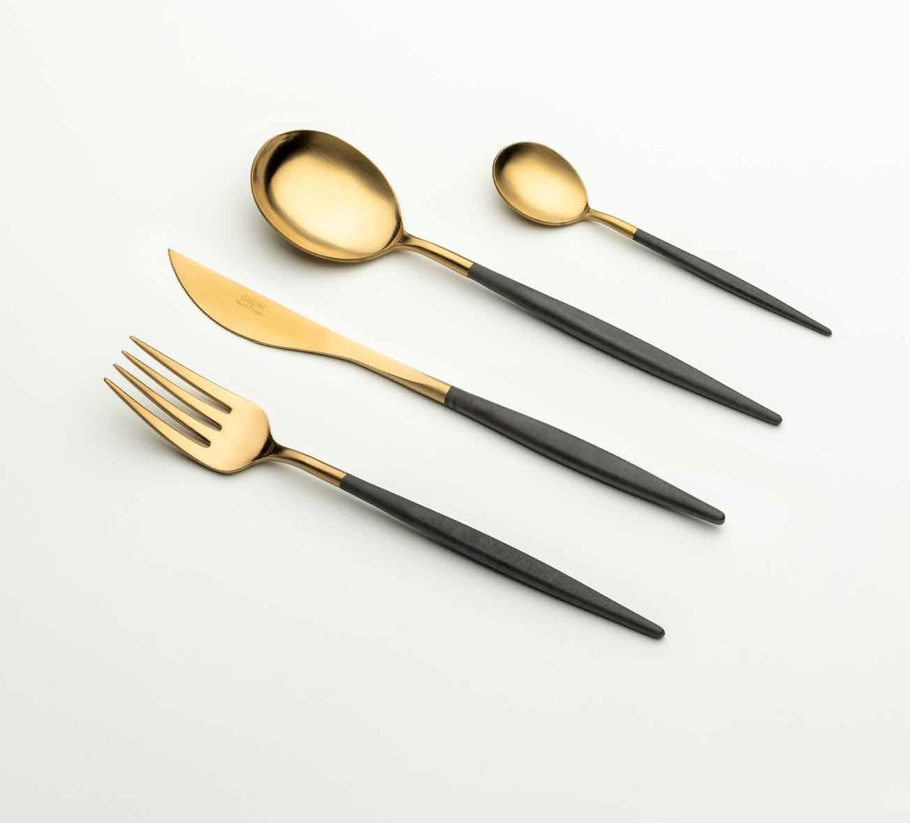 Our cutlery is coated with titanium nitride, a metal with exceptional density and hardness. Made in a vacuum almost like that of outer space, this coating gives the cutlery effective and long-lasting protection against accidental scratches, scuffs and stains that always end up appearing on the cutlery. It is practically as hard as sapphire, which is the hardest stone after diamond.