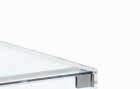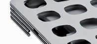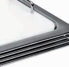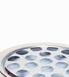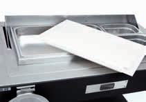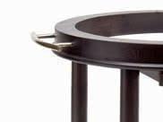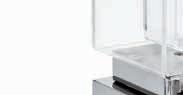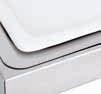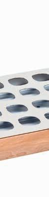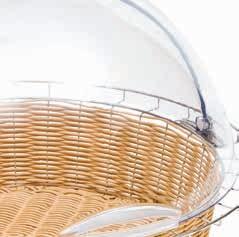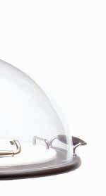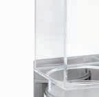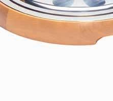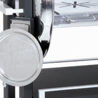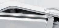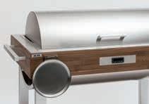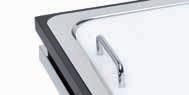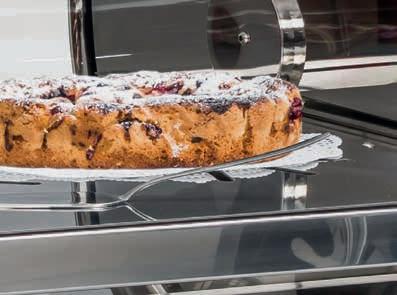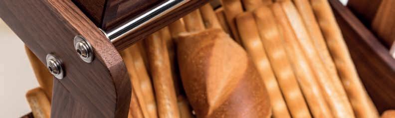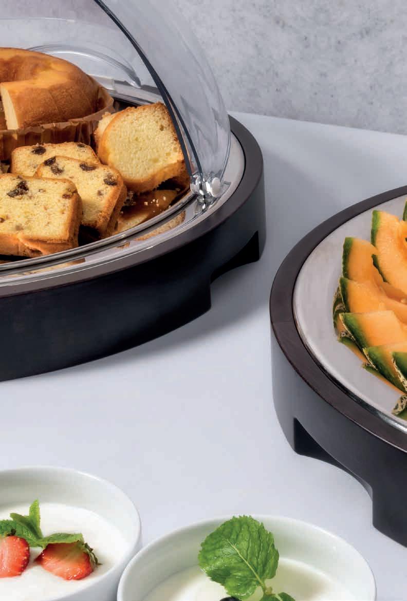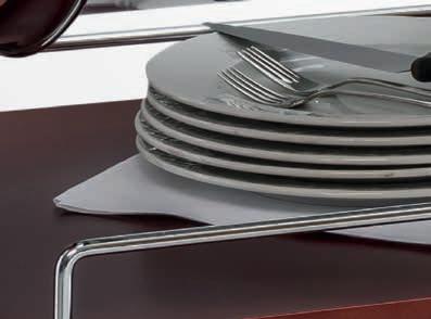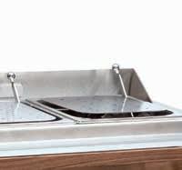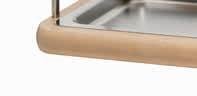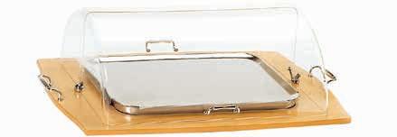 Base in 2 pezzi in acciaio inox 18/10 o una combinazione di acciaio inox e legno massiccio di noce / due piastre eutettiche GN 1/2 / cloche monoblocco con grande apertura su due lati, fi ssata sulla base / inserto GN 1/1 disponibile in acciaio inox 18/10, porcellana e polietilene