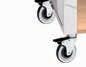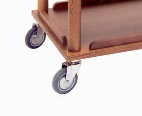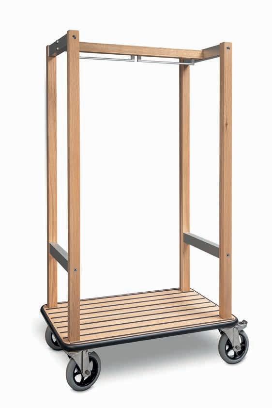 PRATICO luggage trolley Elegant luggage trolley / joints and mounting plates in stainless steel / crosspieces and coat hangers in silver oxidized aluminum / hardwood oak painted with transparent lacquer / base level with horizontal and vertical bumpers made of black rubber / 4 swivel castors with brakes Ø 20 cm