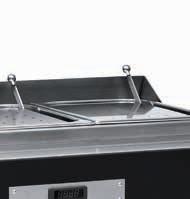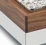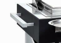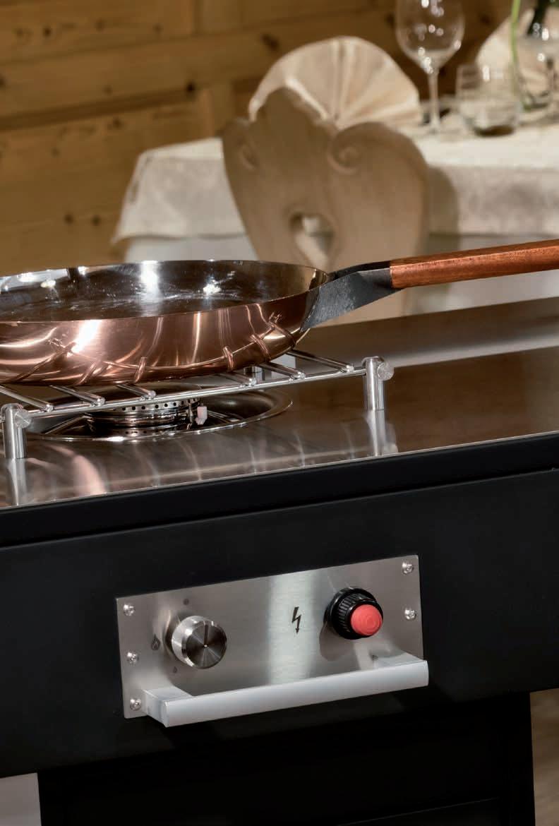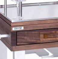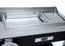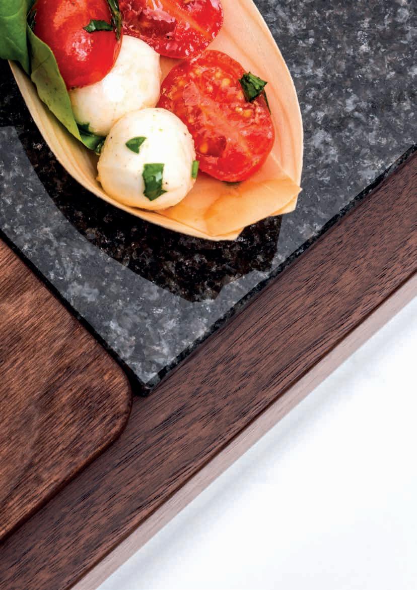 Struttura composta da 2 pezzi in acciaio inox 18/10 o una combinazione di acciaio inox e legno massiccio noce / due piastre eutettiche GN 1/2 / inserti GN 1/2 disponibili in granito scuro, granito chiaro e legno noce