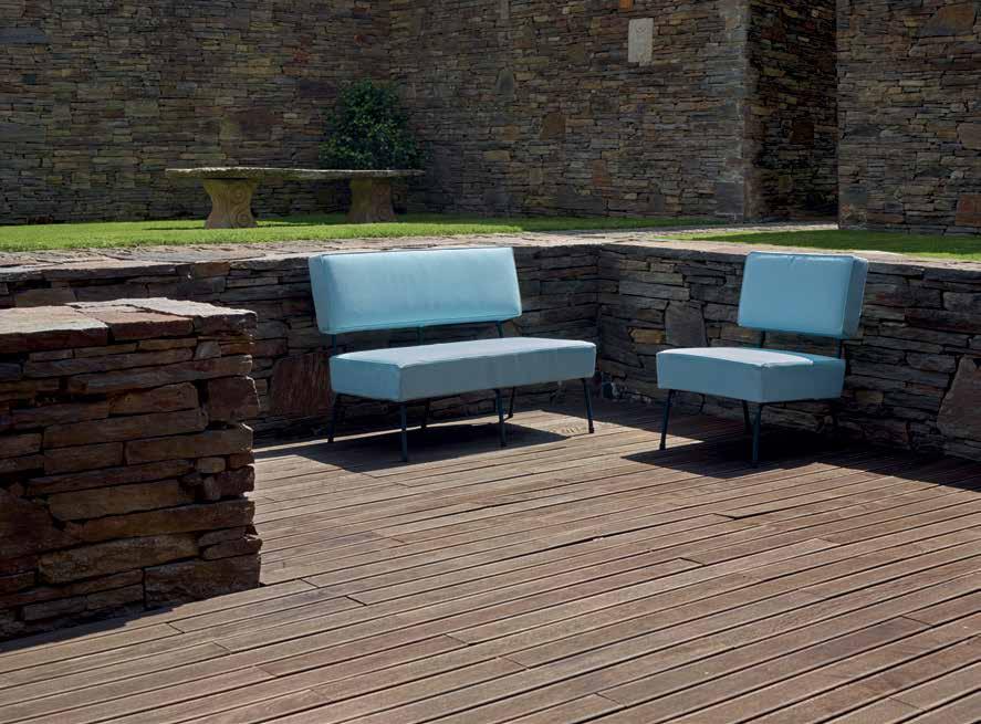 Mod. 404 Estrutura Metálica / Pintura Epoxy / Assento em Réguas de Madeira Izombé e Encosto em Réguas Metálicas ou Assento e Encosto em Réguas Metálicas / De Fechar / Não Empilhável / Exterior — Interior.
