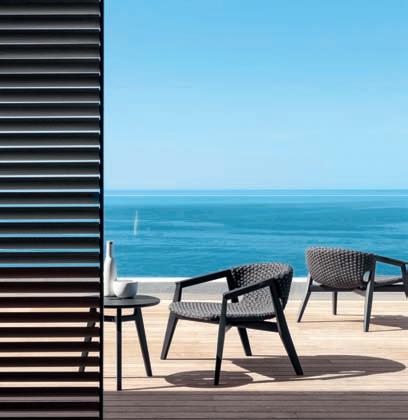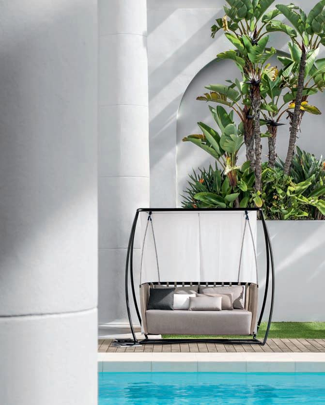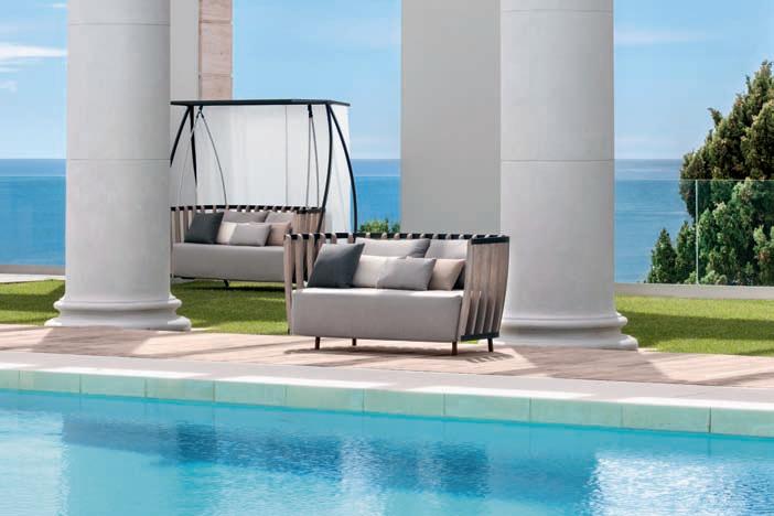 Die Frucht der Zusammenarbeit zwischen Patrick Norguet und Ethimo heißt Swing, eine LoungeKollektion mit doppelter Struktur: Eine äußere aus Metall, eine innere aus gebeizten Teakholzleisten, die wie ein Nest Körper und Geist aufnehmen.