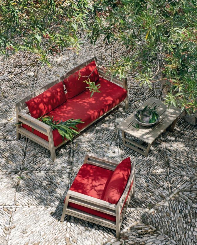 c oussins déhoussables qui s’accordent à tous les modèles de chaises et fauteuils en teck ou en métal de la collection.