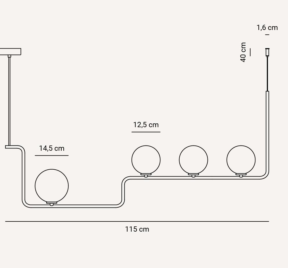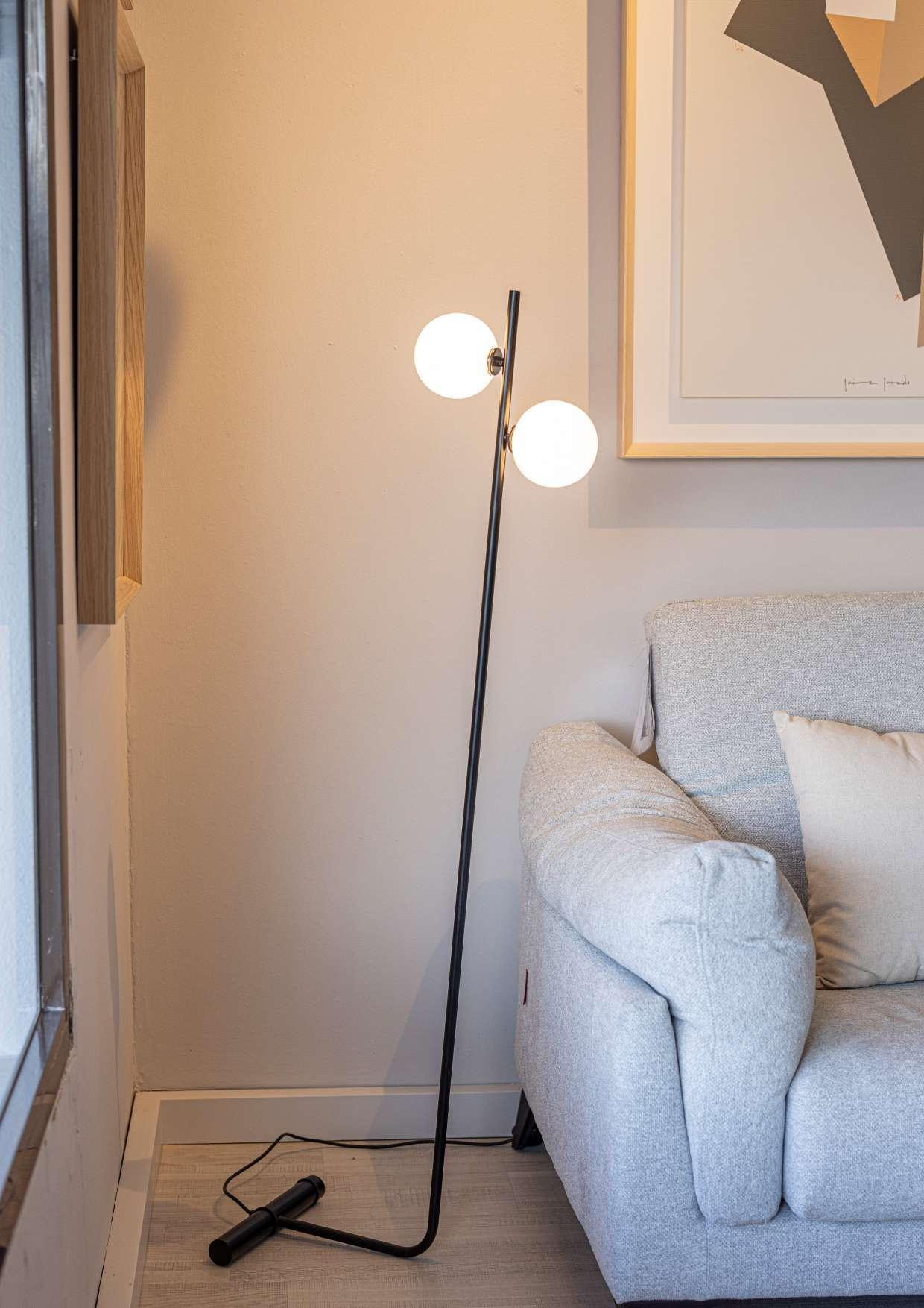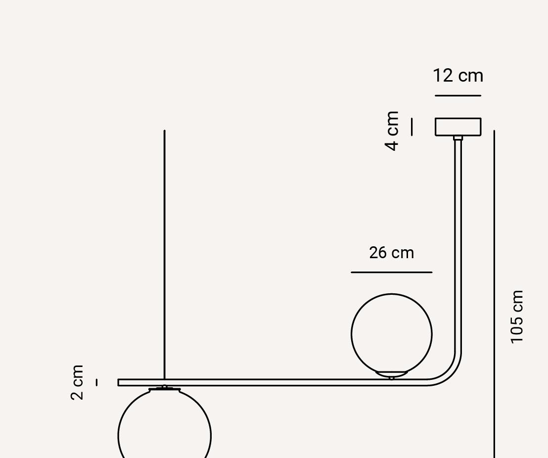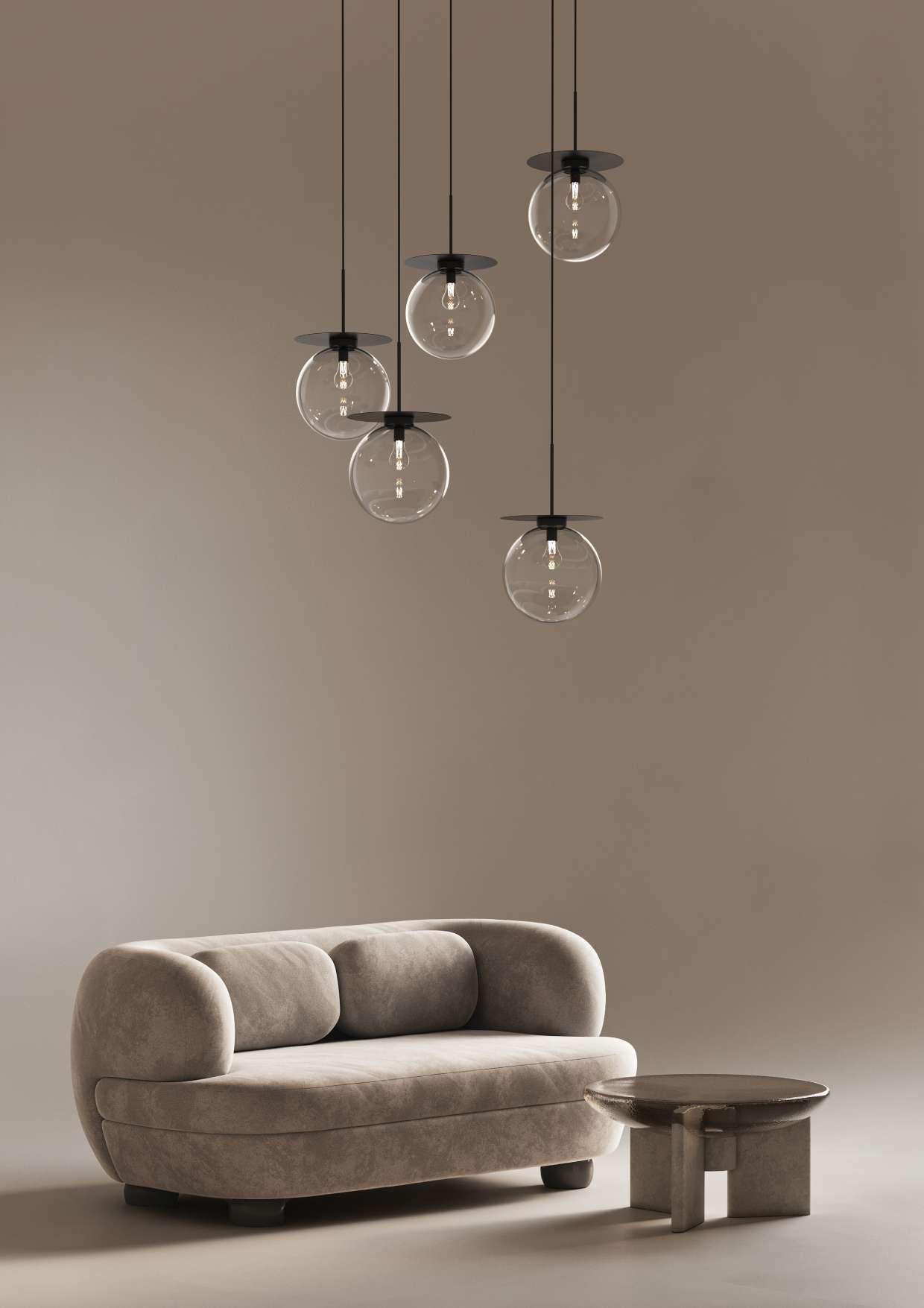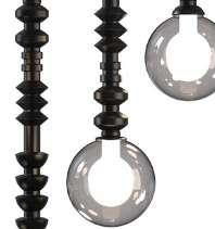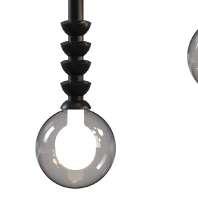El diseño geométrico y la simplicidad de las líneas dan a la lámpara un aspecto escultórico, mientras que la disposición asimétrica de los globos aporta un dinamismo visual.