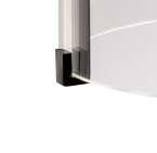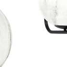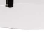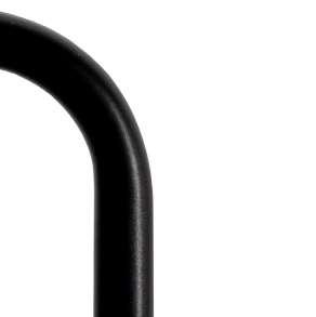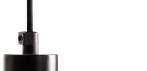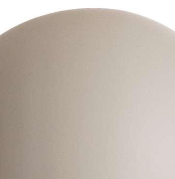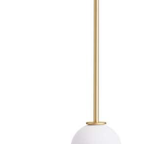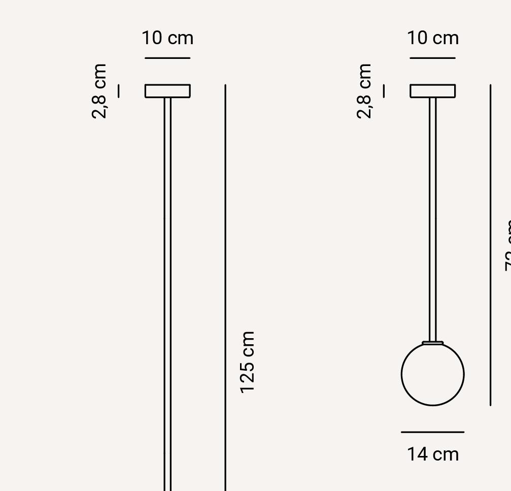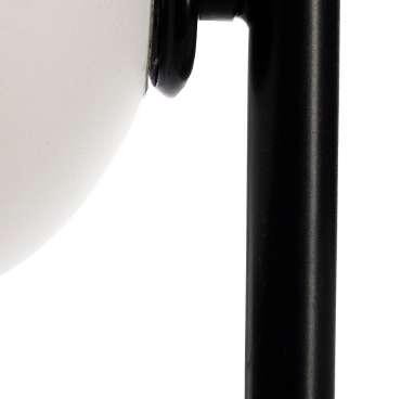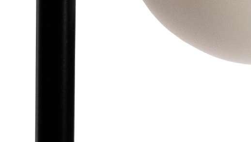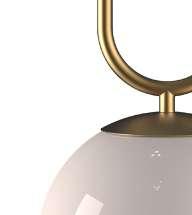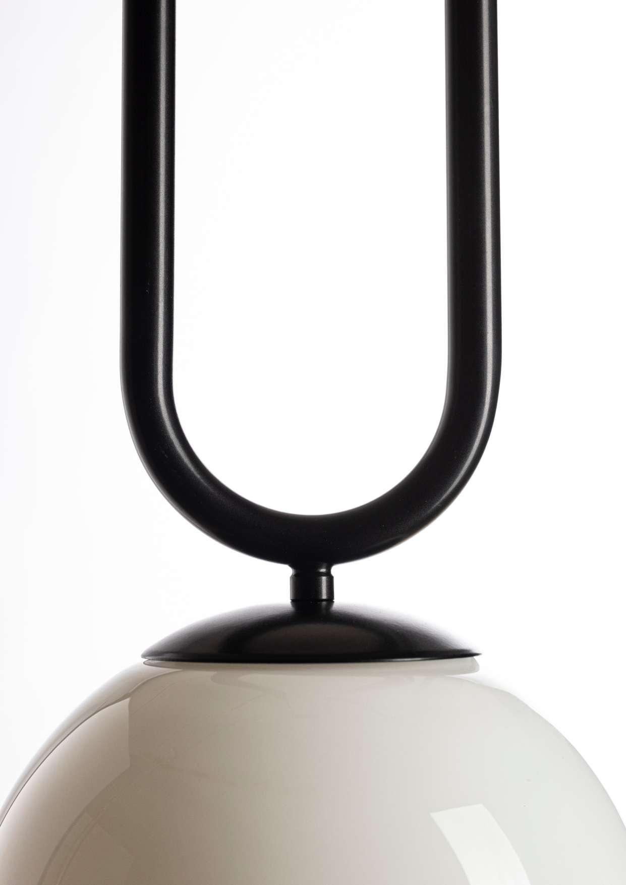 Ferro consta de una esfera de vidrio opalino, perfectamente redonda y de color suave, pende de un soporte metálico negro que se dobla elegantemente sobre sí mismo, creando una forma que recuerda a una horquilla o un lazo. La estructura de la lámpara, con su curva fluida, parece abrazar y sostener la esfera, dando la impresión de que la pieza está suspendida.