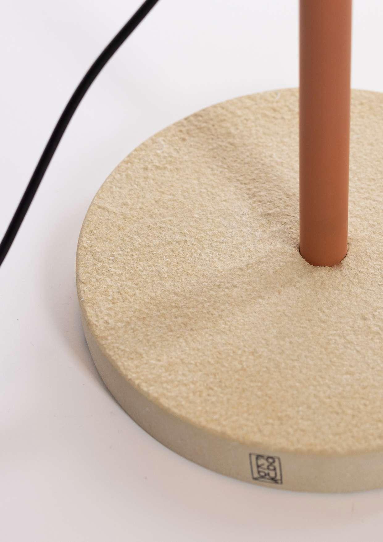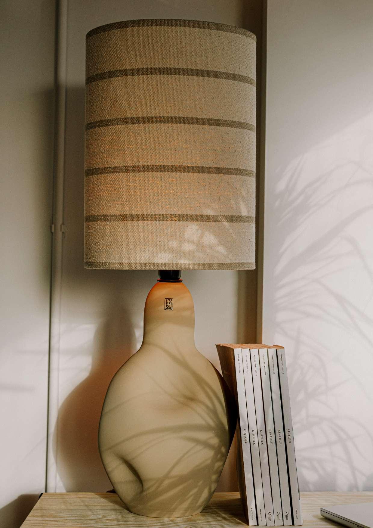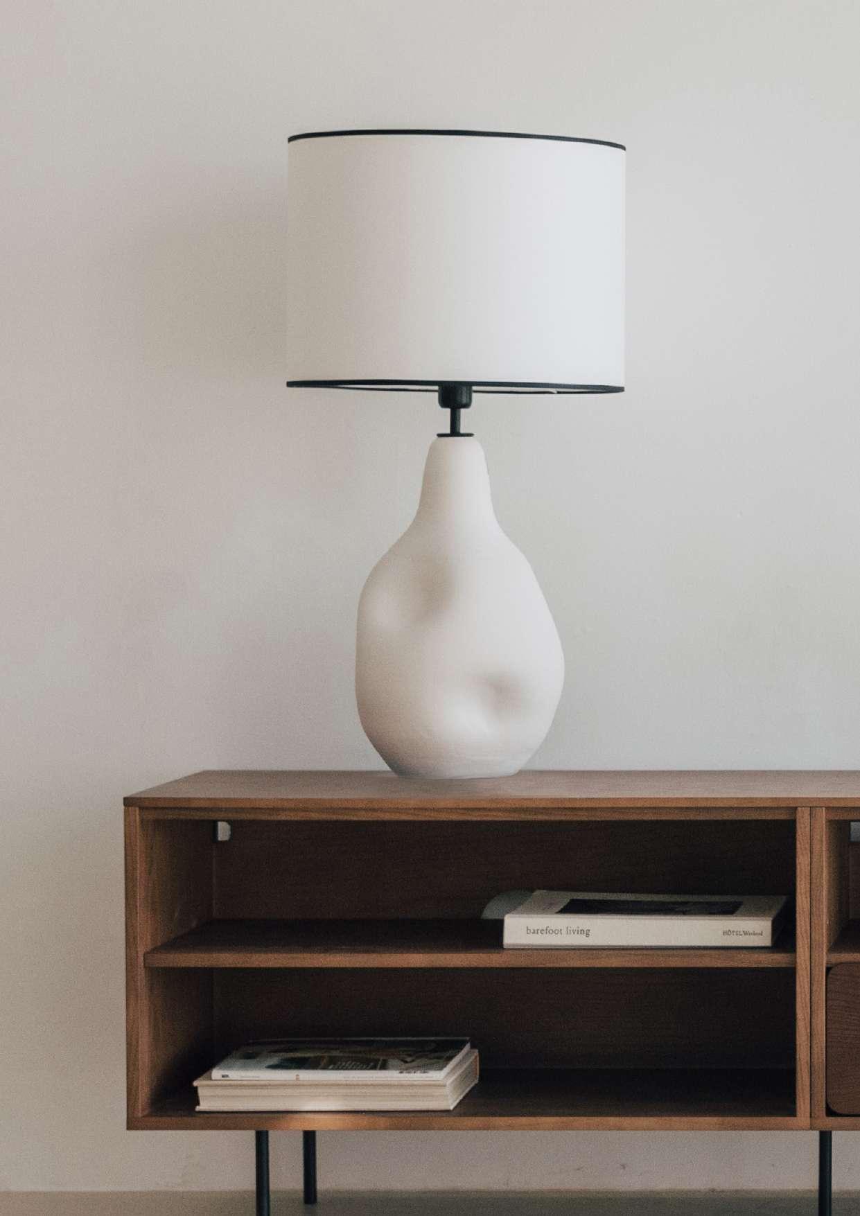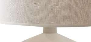Esta lámpara de mesa destaca por su base cerámica, cuyo diseño intencionalmente deformado aporta un atractivo estético y un carácter artesanal distintivo. El acabado mate en tono beige neutro y las sutiles imperfecciones de la superficie enfatizan su calidad orgánica y añaden un toque humano a la pieza. Esta característica, lejos de ser un defecto, es un tributo a la belleza de las imperfecciones naturales y la singularidad de la cerámica hecha a mano.