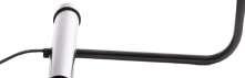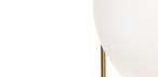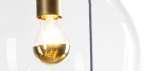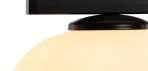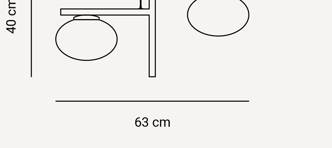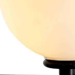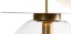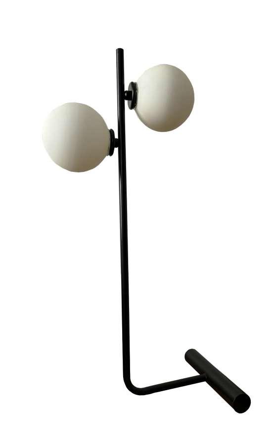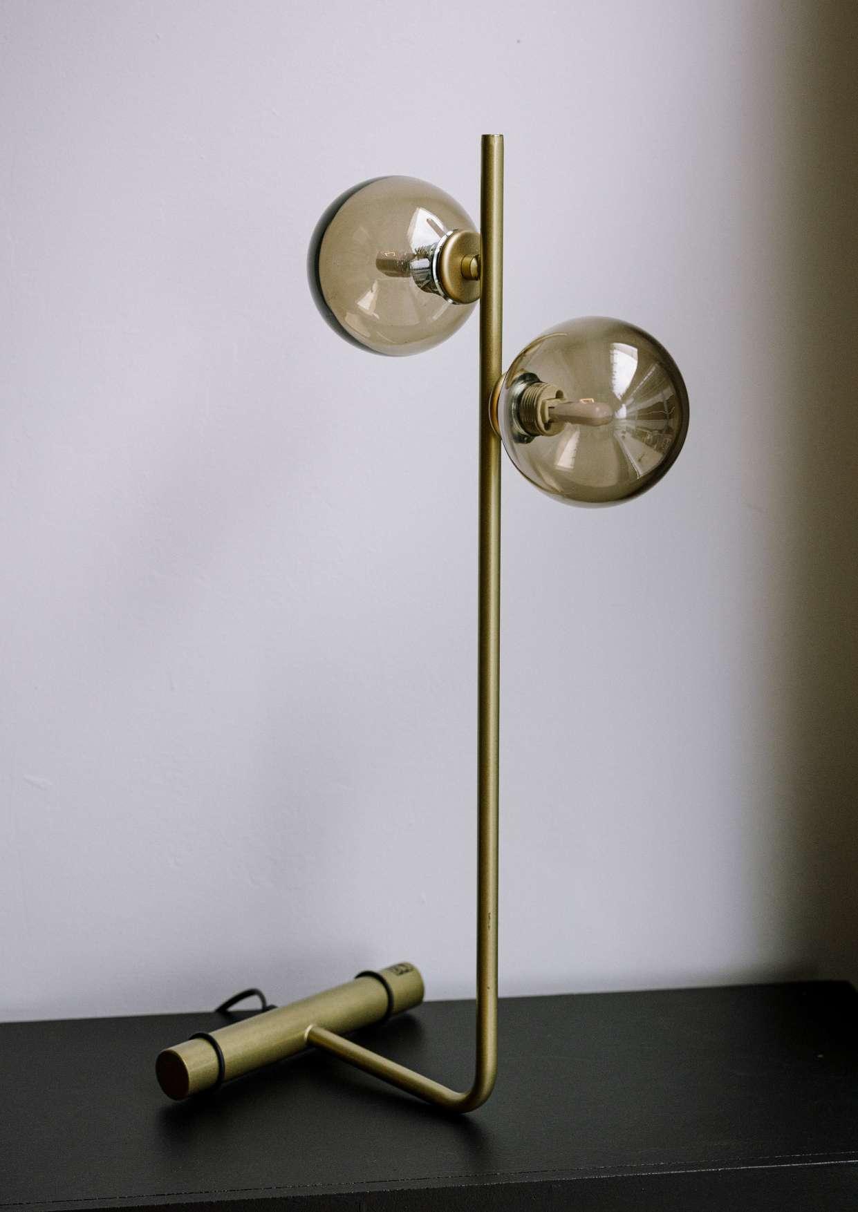 La Lineal de sobremesa dispone de una estructura de metal que sostiene dos globos de vidrio que parecen casi flotar en el aire. Cada globo está unido a un brazo que se extiende desde la barra vertical central, y su transparencia sugiere una ligereza que contrasta con la solidez del soporte.
