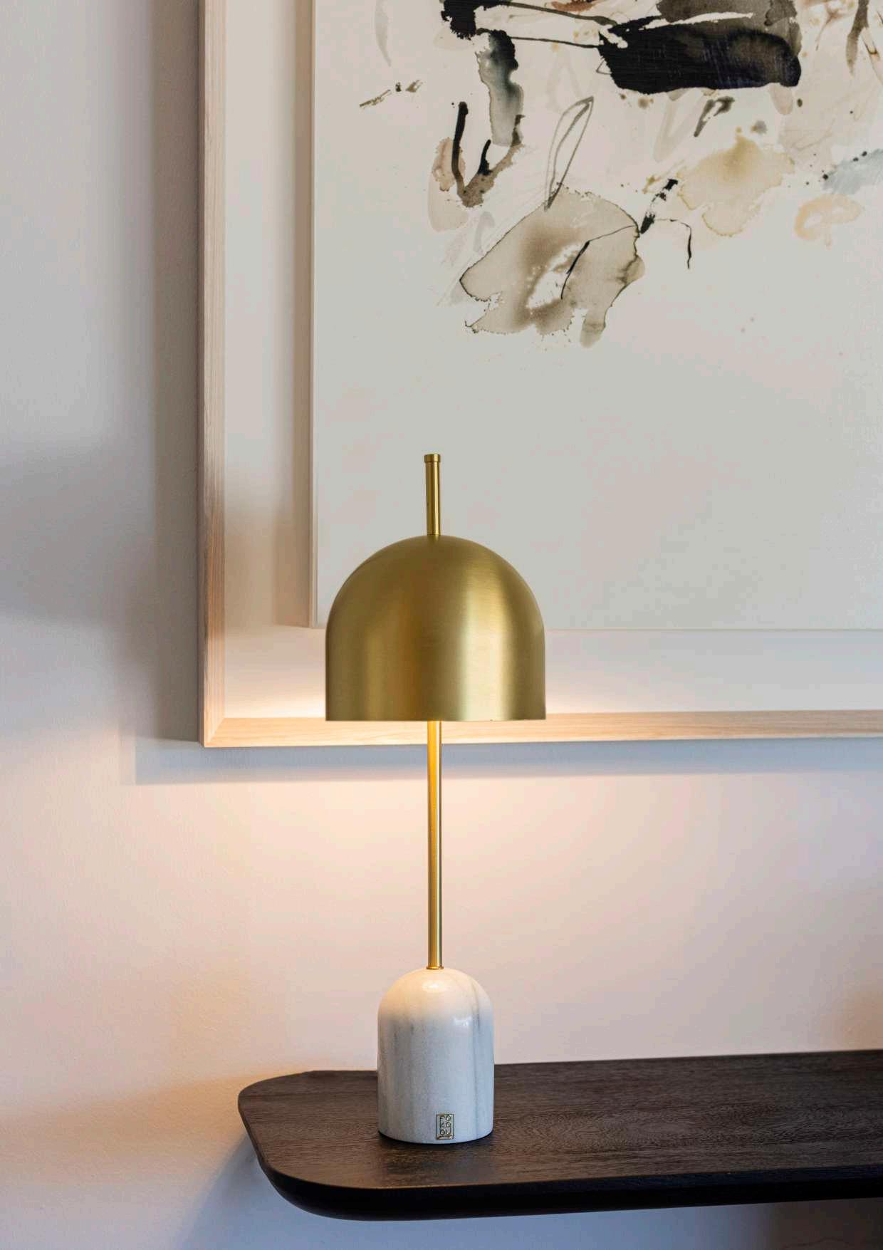 La lámpara de sobremesa Camila presenta un estilo único, su cúpula sostenida por una barra anclada a una base de mármol la dota de elegancia y singularidad, generando una luz agradable que envuelve el entorno. Además, está disponible en diversos acabados para adaptarse a diferentes espacios.