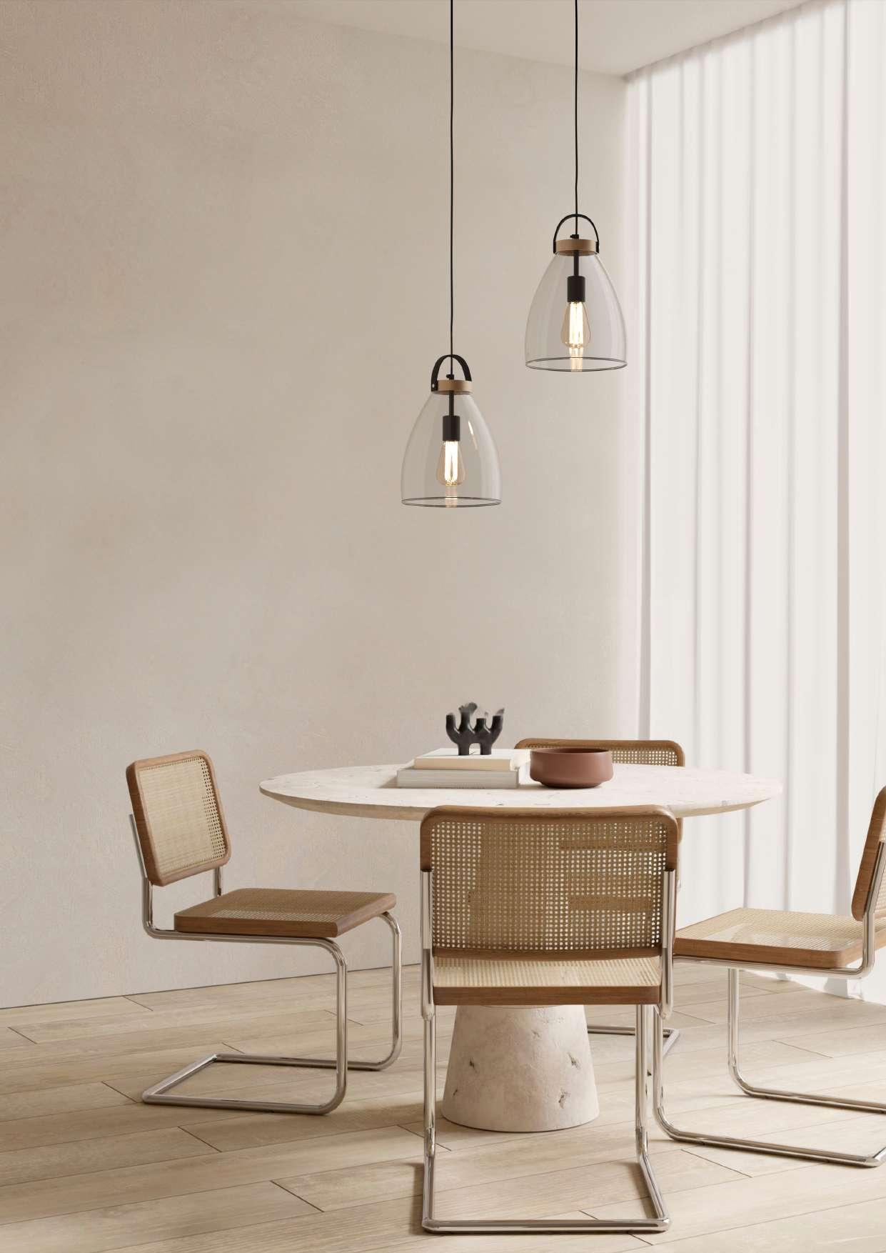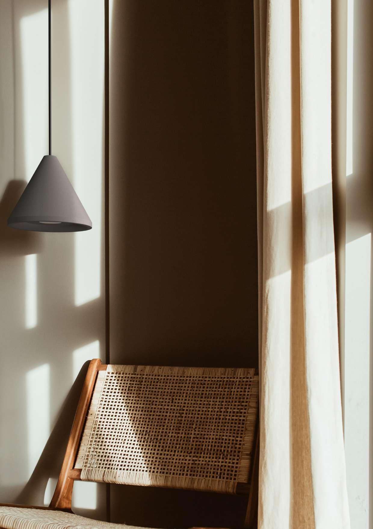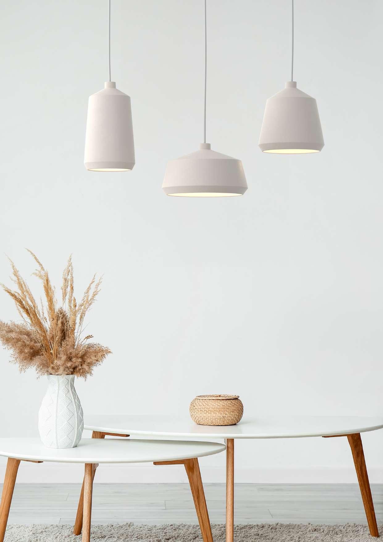 Camila tiene un diseño simplificado y contemporáneo, suspendida de un cable discreto. La superficie lisa y sin adornos es representativa de la funcionalidad y eficiencia visual que a menudo se encuentran en el diseño industrial. Refleja influencias del estilo que se centran en la simplicidad, la artesanía y el uso de materiales que transmiten una sensación de calidez y naturalidad.