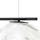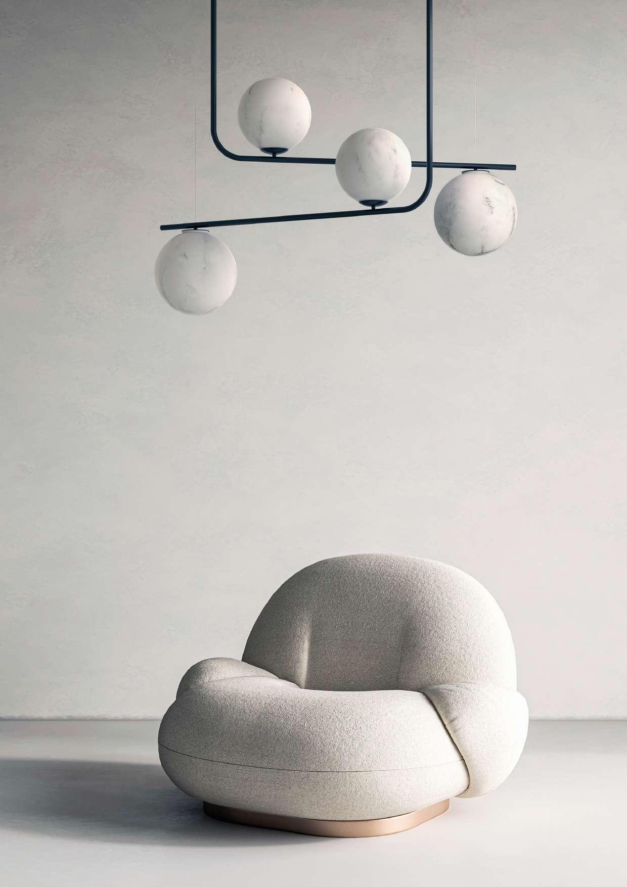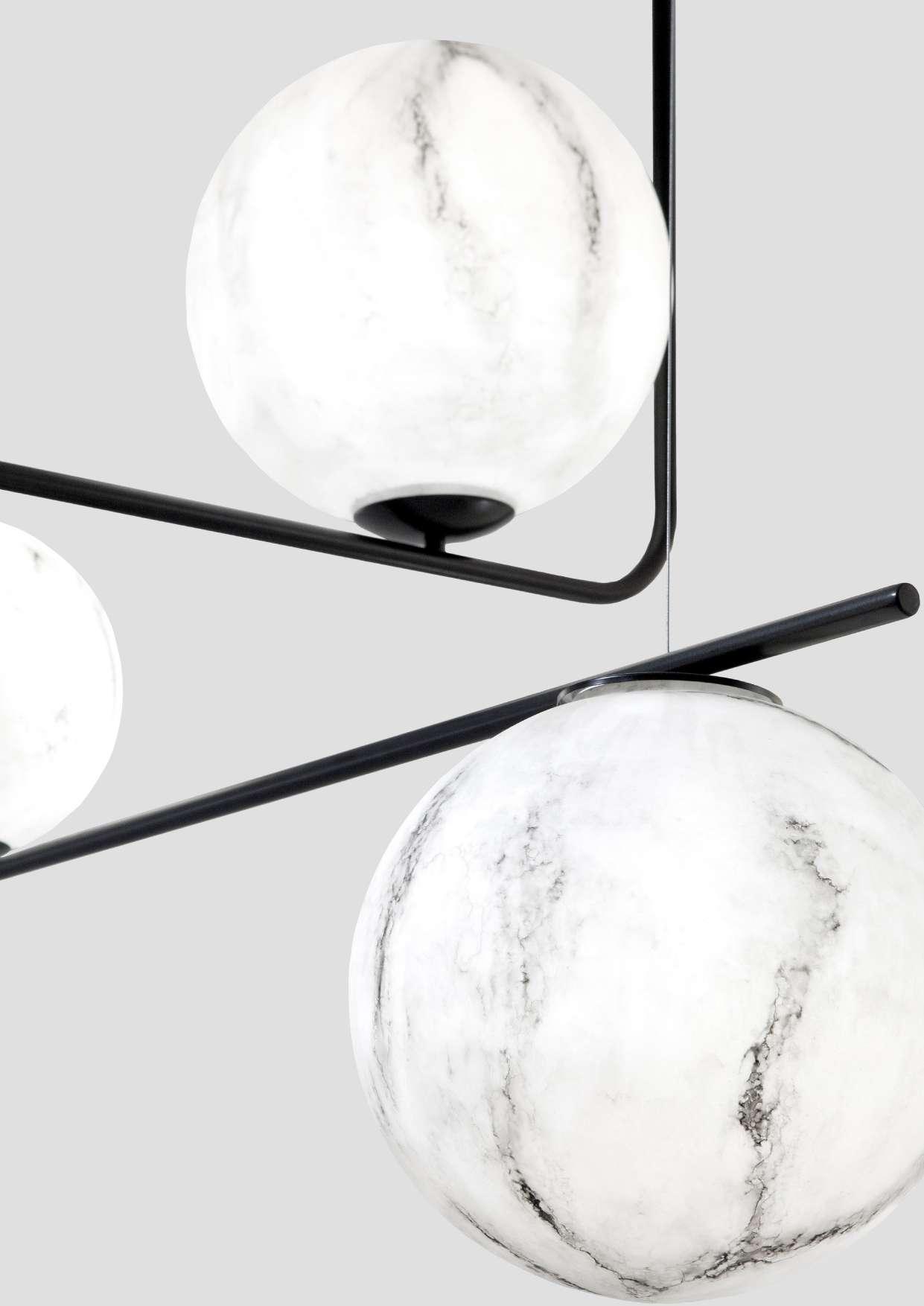 Esta lámpara titulada “Equilibre” es una expresión de balance y estética en el diseño de iluminación. Cuatro esferas con acabado en mármol blanco, se suspenden a diferentes alturas y posiciones a lo largo de una estructura lineal negra. La disposición de estas esferas no es al azar; cada una está cuidadosamente posicionada para que, visualmente, contrarreste el peso de la estructura, creando una armoniosa ilusión de equilibrio.