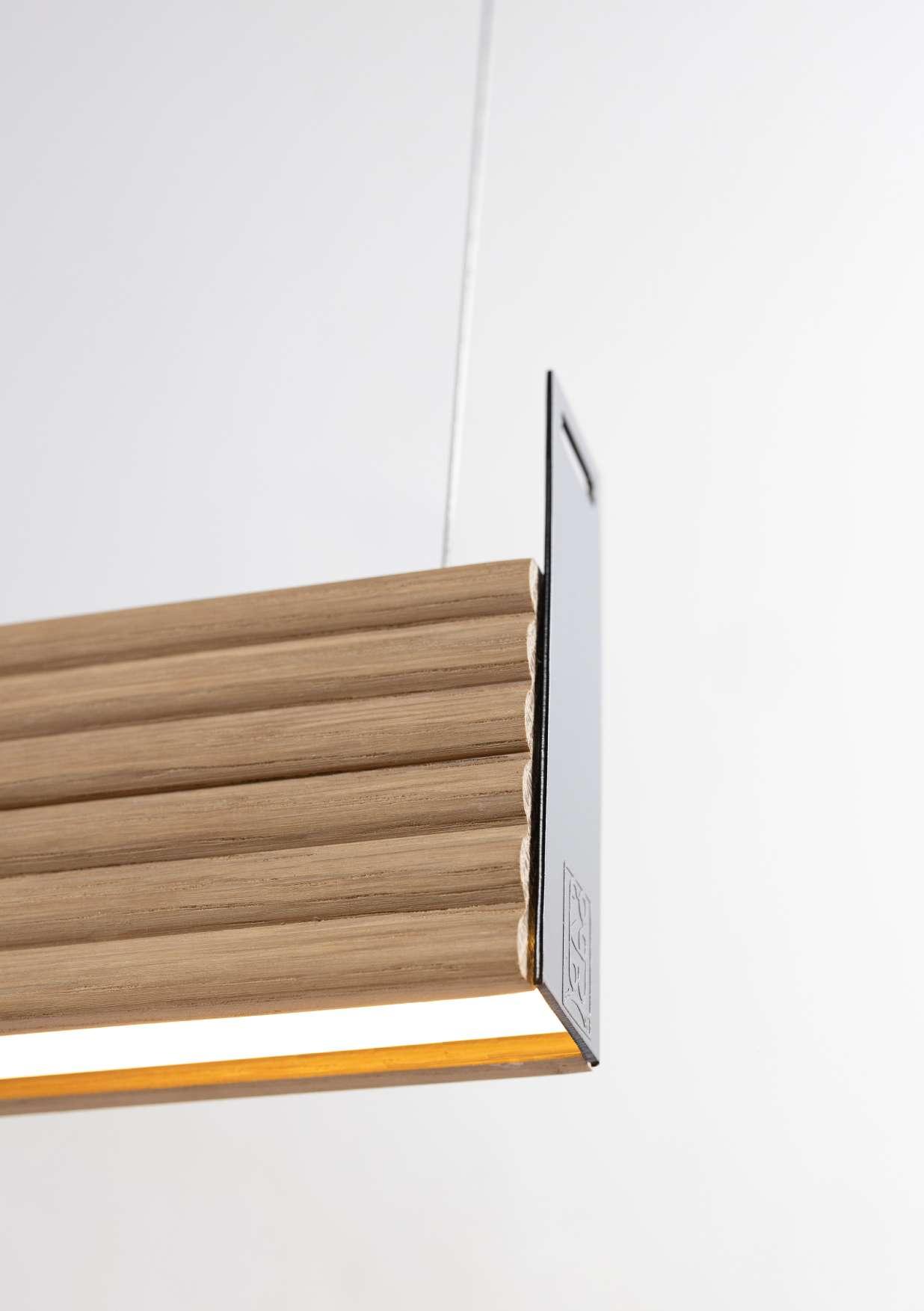 Cielo presenta una base de madera de abedul y una pantalla alargada. Su diseño se centra en la integración del portalámparas de manera discreta, logrando una continuidad armoniosa en su estructura. Su amplia pantalla emite una luz ambiental encantadora, proporcionando una experiencia visual agradable y acogedora.