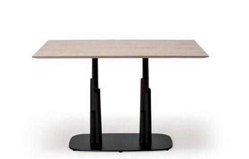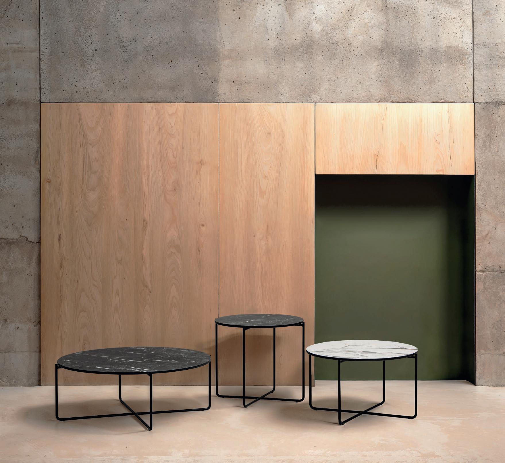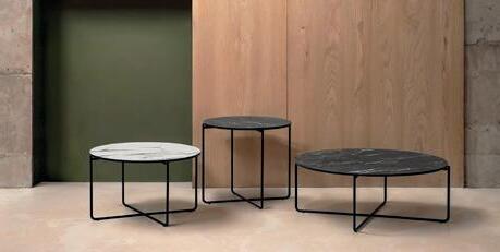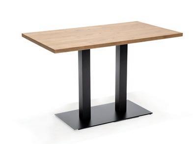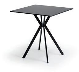 Collection de tables avec une colonne et base métallique en forme de croix, avec un style simple qui s’intègre dans n’importe quel espace.