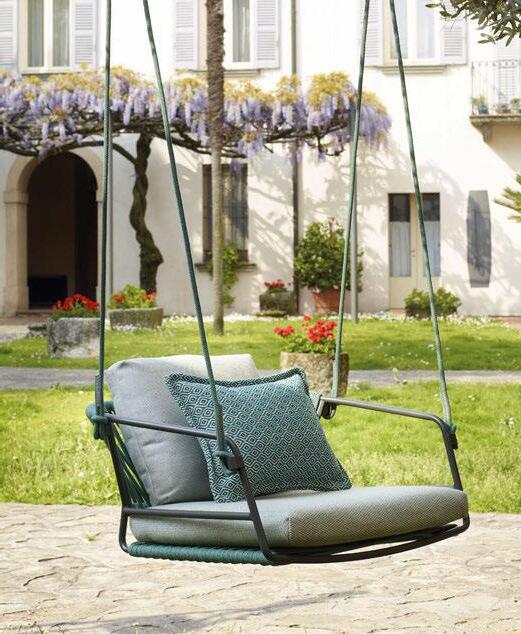 The Lisa outdoor collection is joined by an original and precious complement, a suspended armchair to experience pleasure and relaxation. Lisa Swing in powder-coated tubular steel, has seat and backrest in woven nautical rope.
