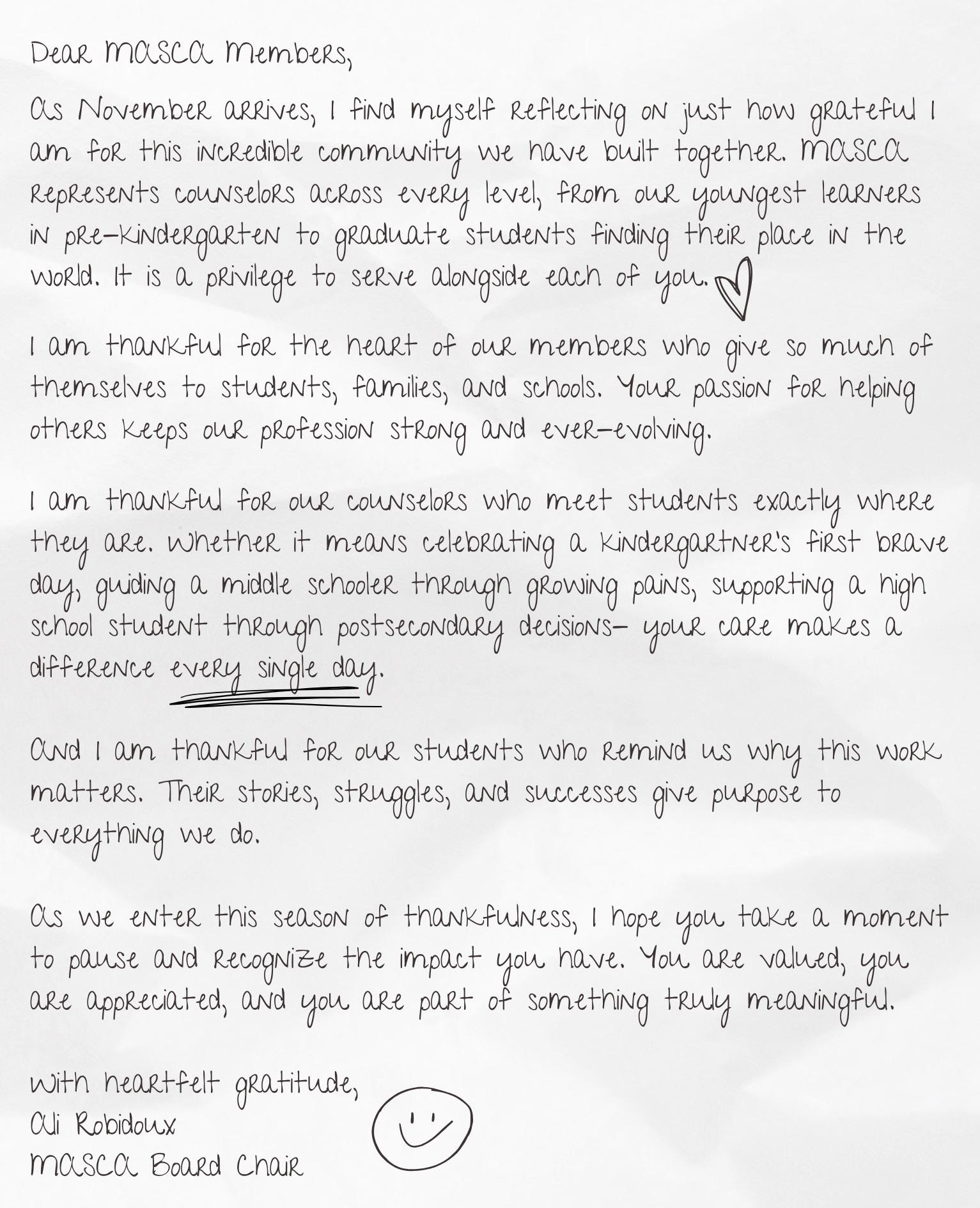 I joined MASCA looking for connections and to find ways to contribute to the school counseling field. Often in our roles, we can be part of a very small team, or in my case, the only counselor in the building. MASCA offers so many amazing opportunities to build your network of school counselors, increase your own knowledge, and give back to the profession.