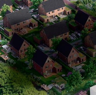 Door het gebruik van natuurlijke materialen en aardse tinten gaan de woningen perfect op in de groene omgeving. En toch vallen ze op dankzij de speelse variatie in de gevelafwerking.