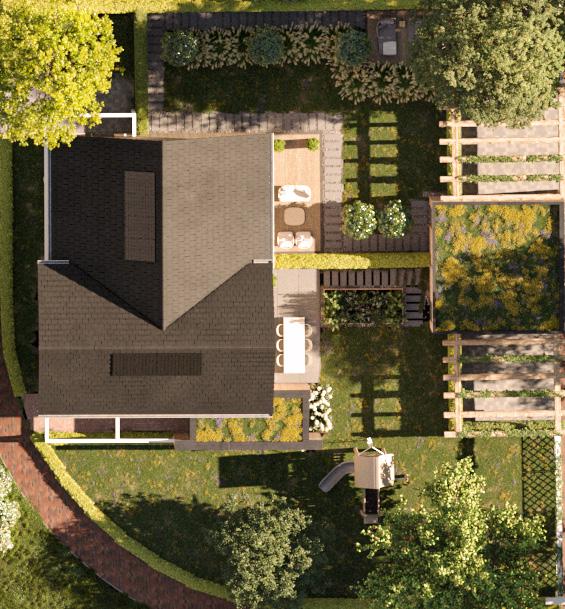 De pergola aan de voorzijde van de woning accentueert op speelse wijze de overgang tussen privé en het gemeenschappelijk erf. Het gemeenschappelijk erf heeft hierdoor de uitstraling van een knus hofje. Hier rijden geen auto’s. Hoe lekker is het als de kinderen zo vanuit de voordeur zorgeloos kunnen spelen?
