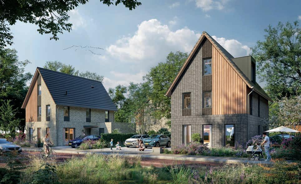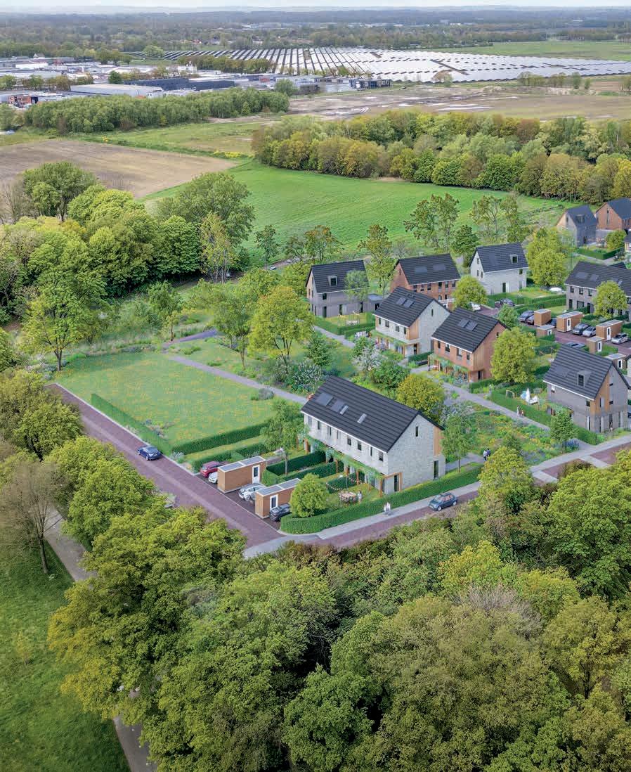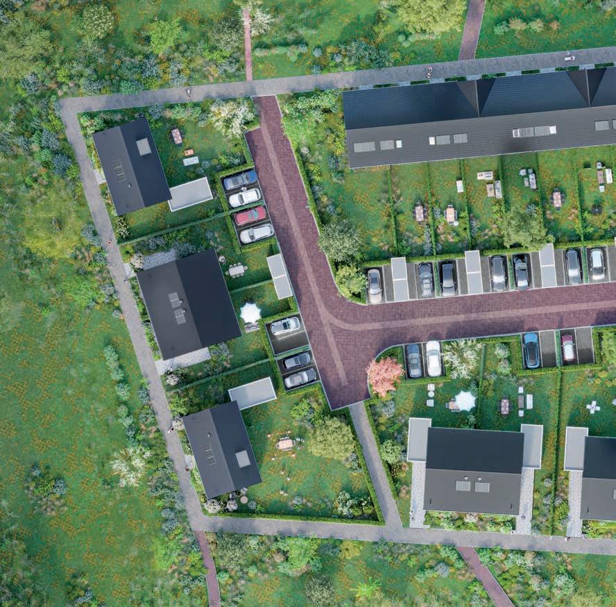 Aan de voorzijde is fors ingezet op een maximale natuurbeleving. Aan de achterzijde zijn speciaal ontworpen straten voor auto’s, bezorgdiensten en fietsen. Daar vind je ook de bergingen en parkeerplaatsen. Groene pergola’s en erfafscheidingen zorgen voor privacy.