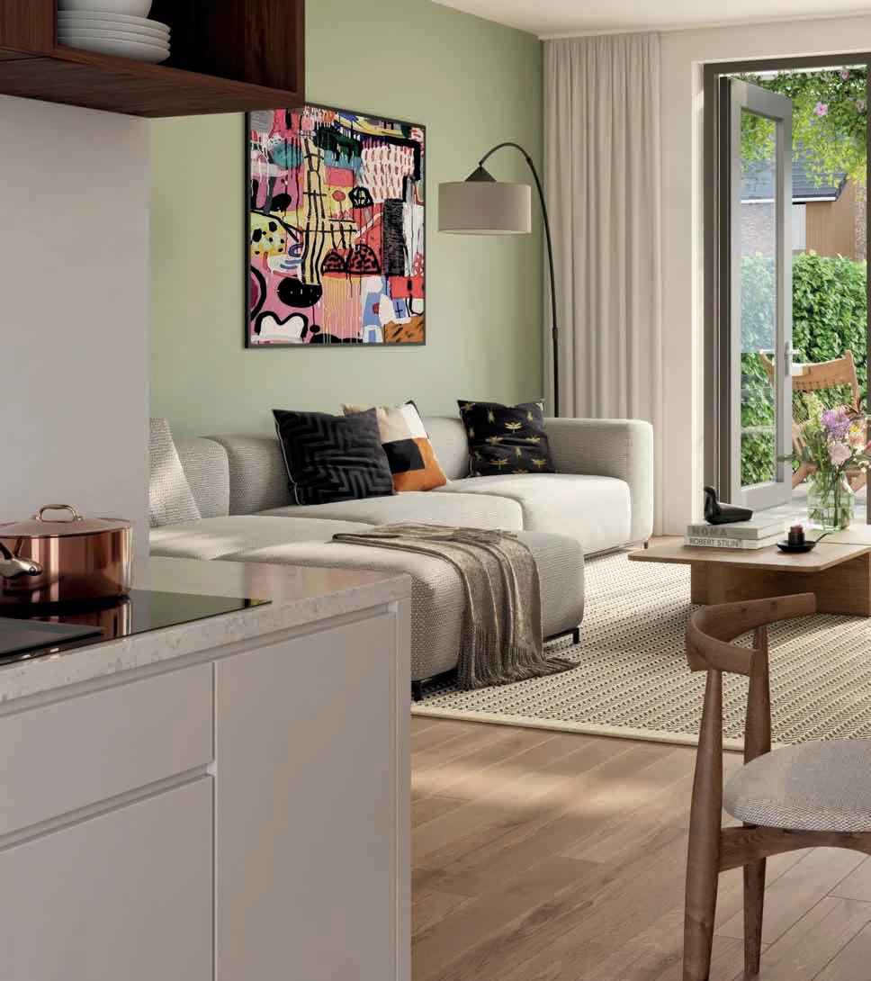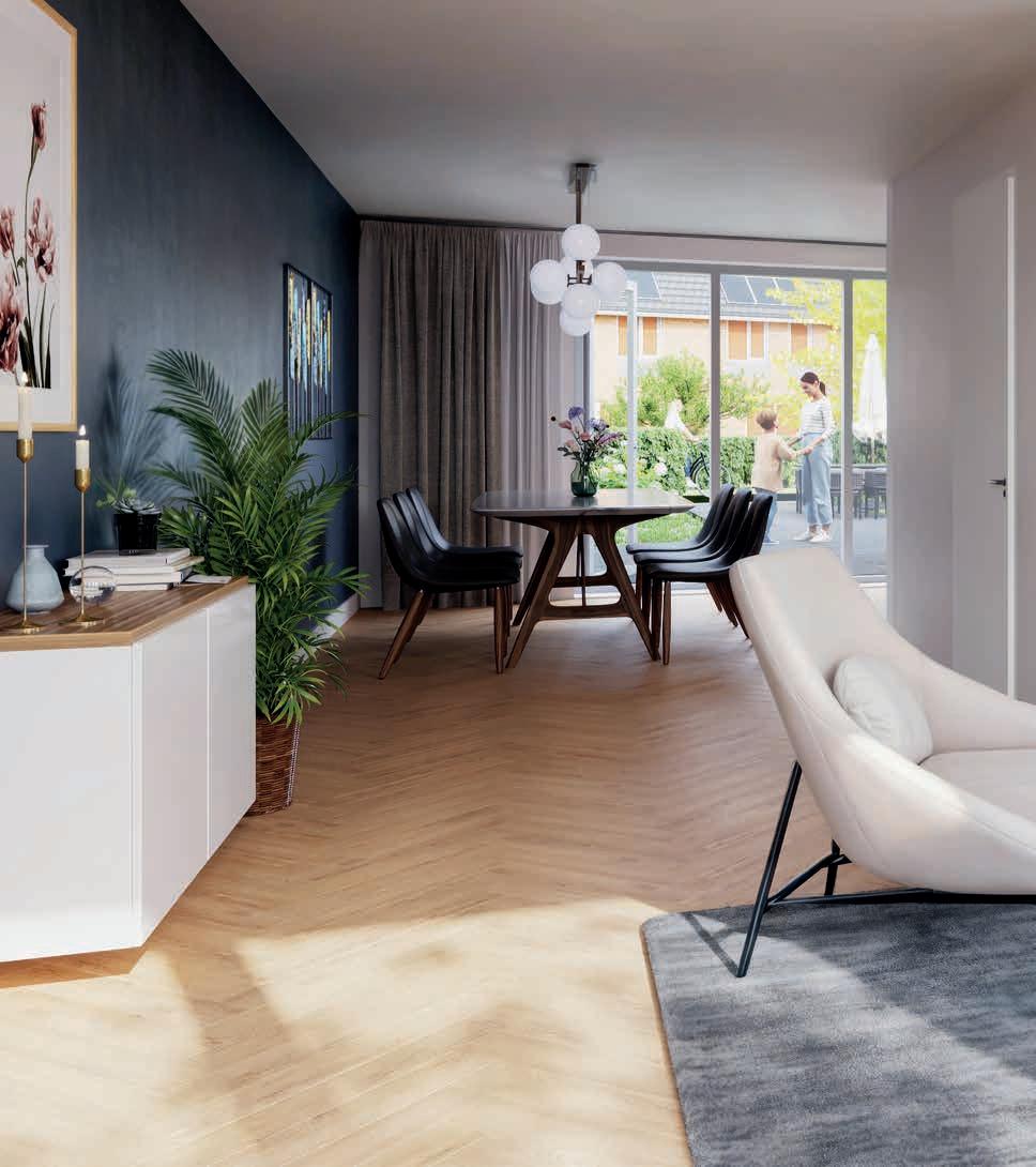 Alle perspectieftekeningen en afbeeldingen in deze brochure geven een impressie weer en dienen als illustratie. Ondanks alle zorgvuldigheid die we hebben nagestreefd, kunnen aan deze tekeningen en afbeeldingen geen rechten worden ontleend. De afbeeldingen komen van de hand van een illustrator en worden daarom met recht ’artist impressions’ genoemd. De werkelijke kleuren van de gevels, schilderwerk en dakbedekkingen kunnen hiervan afwijken. Ook de plattegronden in deze brochure kunnen opties bevatten, welke door de aannemer aangeboden worden. De plattegronden, alsmede de afmetingen van sanitair en keuken van alle in deze brochure opgenomen woningen zijn indicatief. Hier is dus geen leveringsplicht aan verbonden. Deze brochure maakt geen deel uit van de contractstukken. Tijdens een eerste gesprek bij de makelaar worden de contractstukken van de woning verstrekt. April 2025.