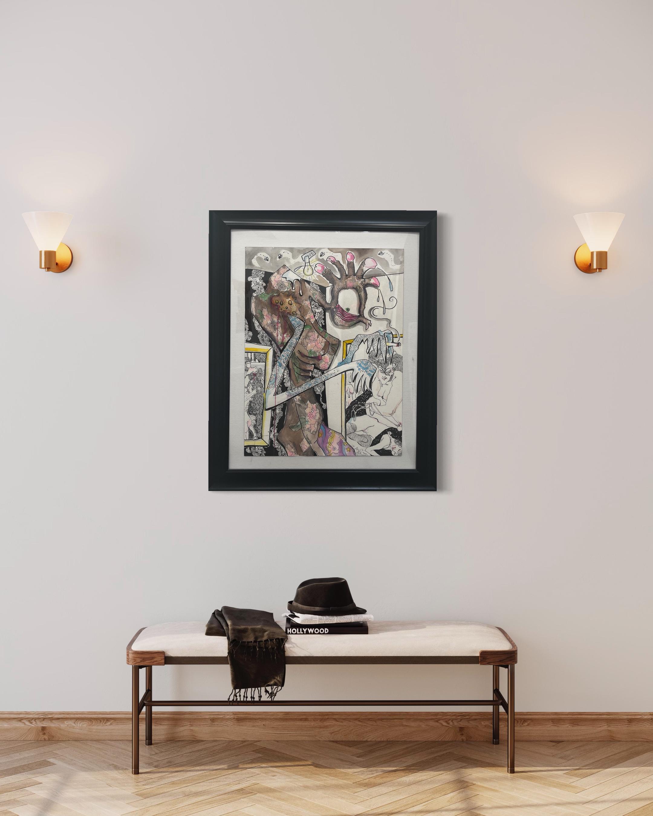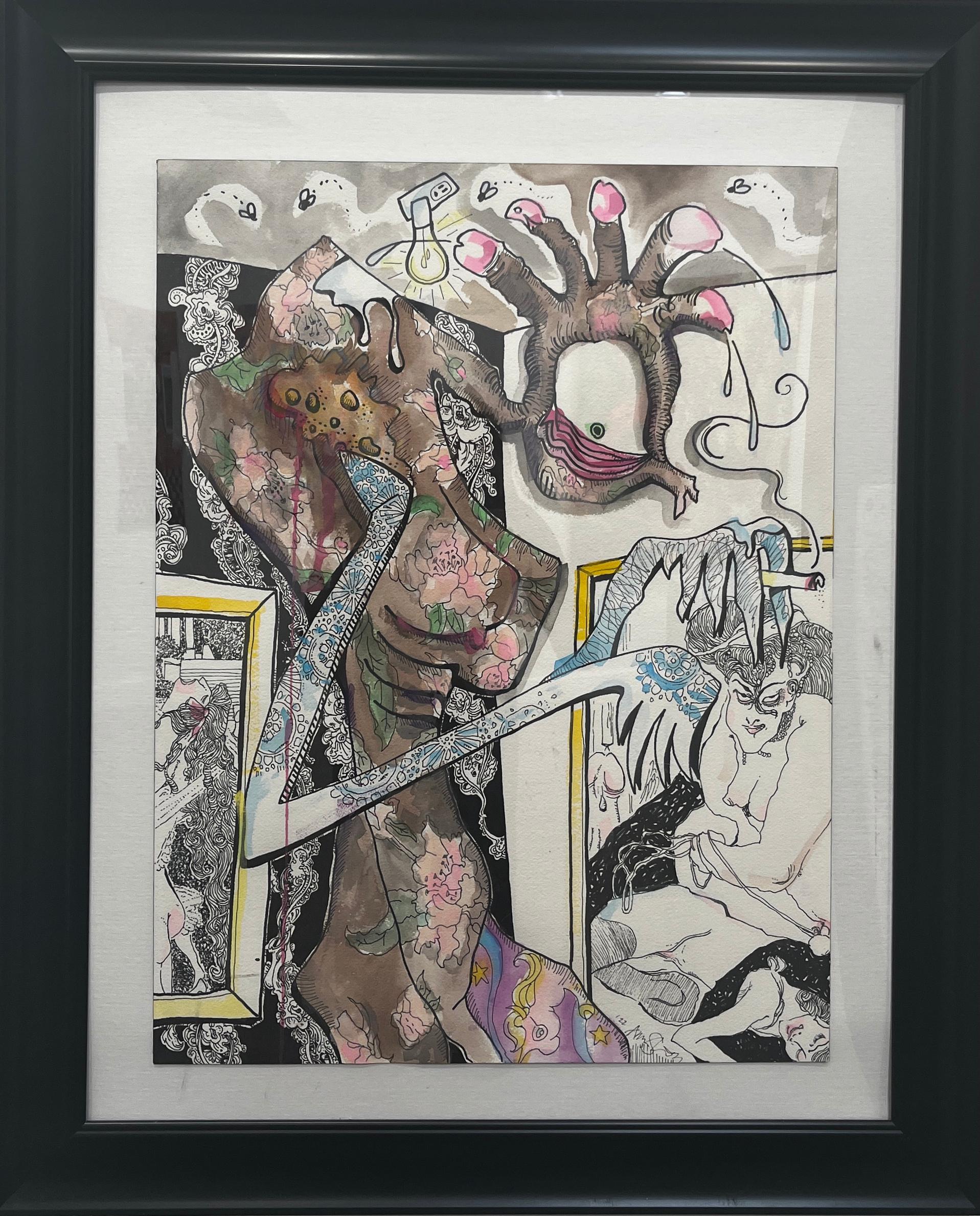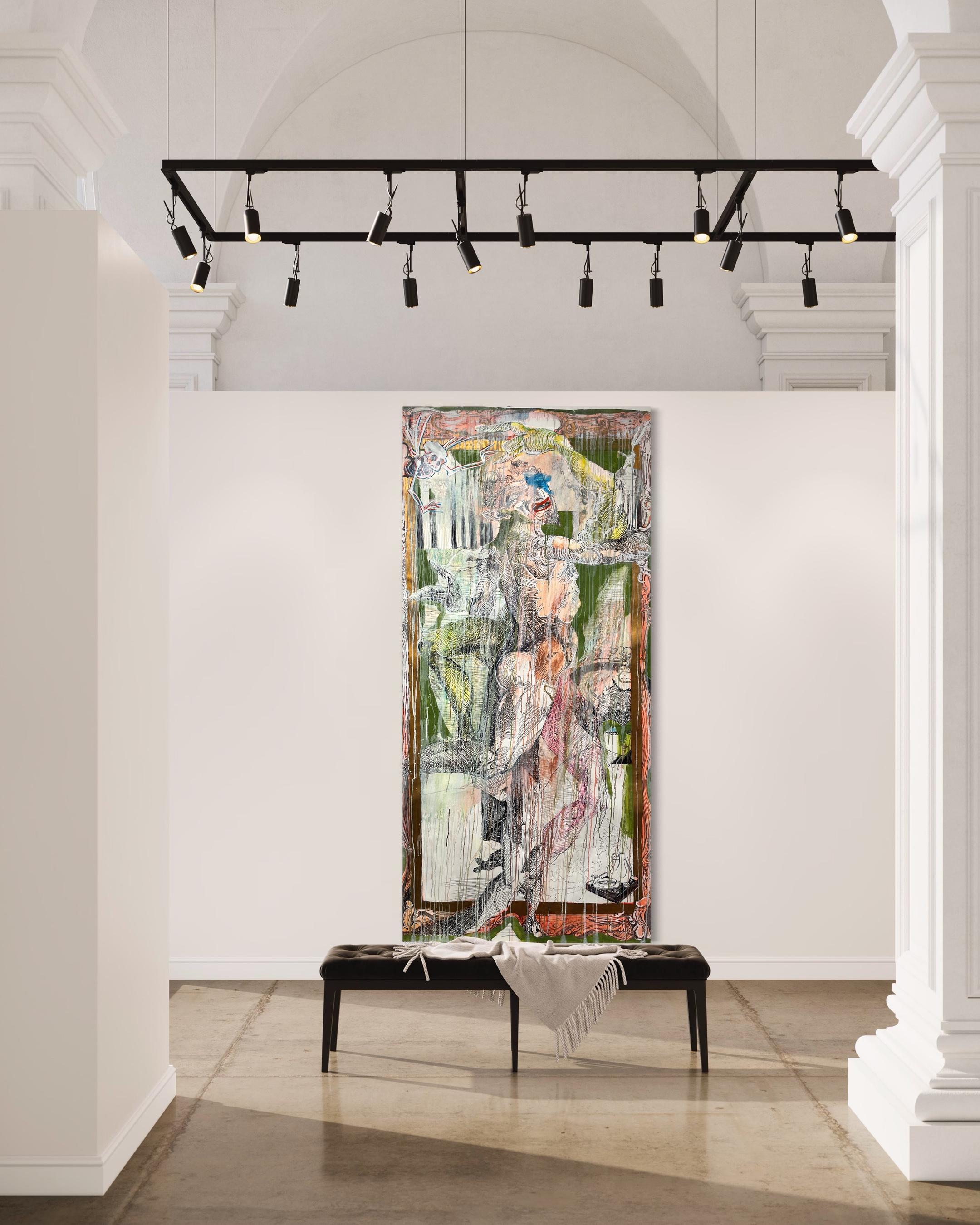 Artist Aaron Sheppard "Psyche's Abduction of Mercury" Ink, oil, acrylic, photo collage on paper 91" X 42"