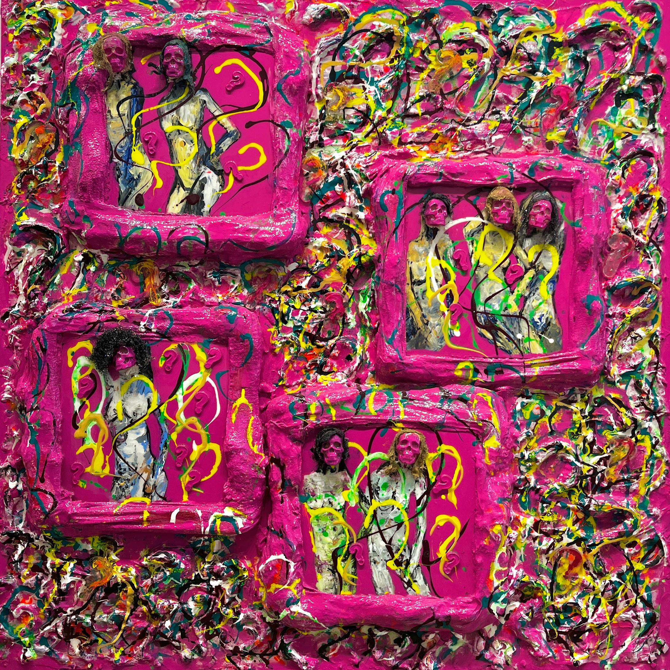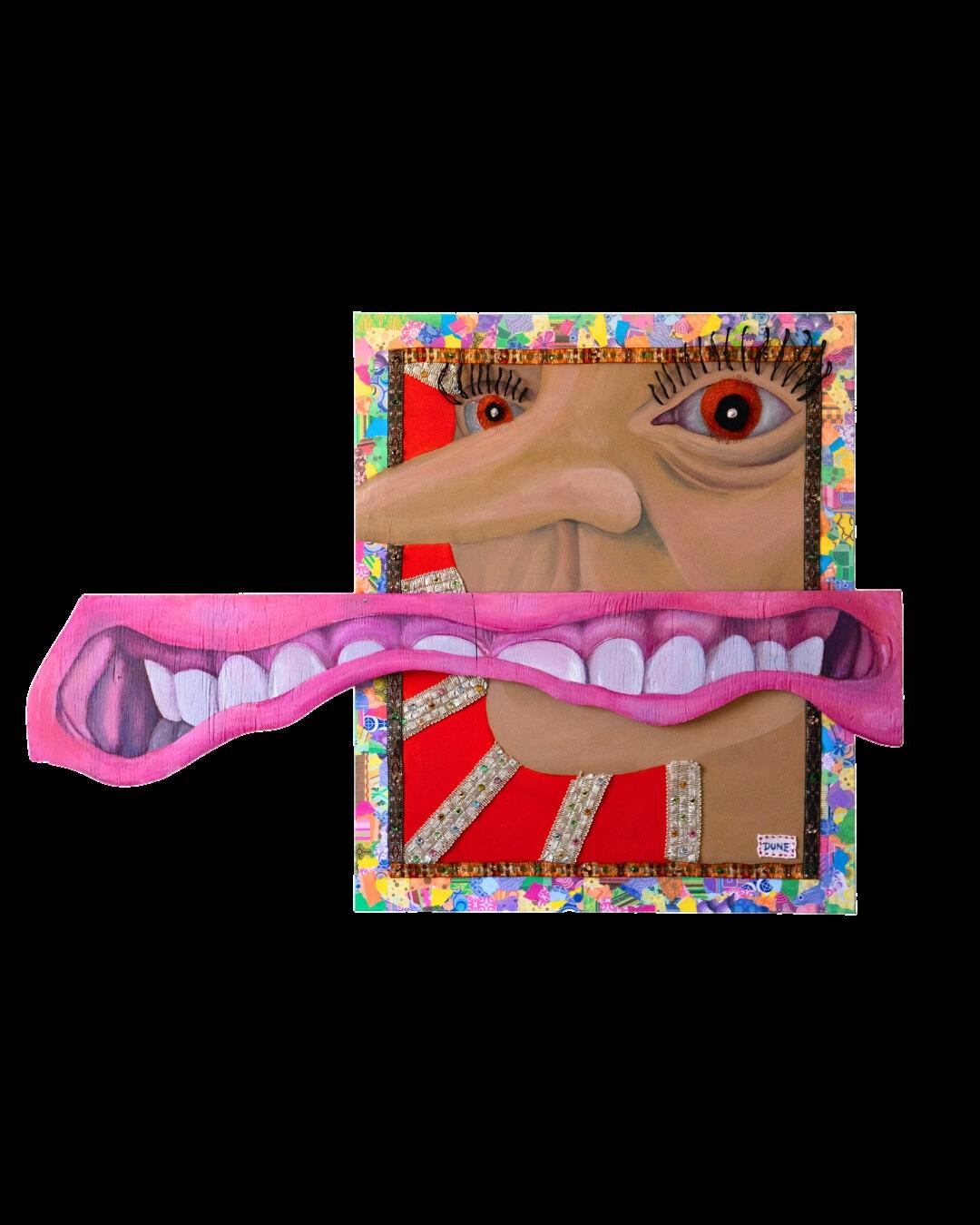 Acrylic, colored pencil, paper, glitter, thread, foil and fabric on canvas and paper mache 35″ x 28″ inch