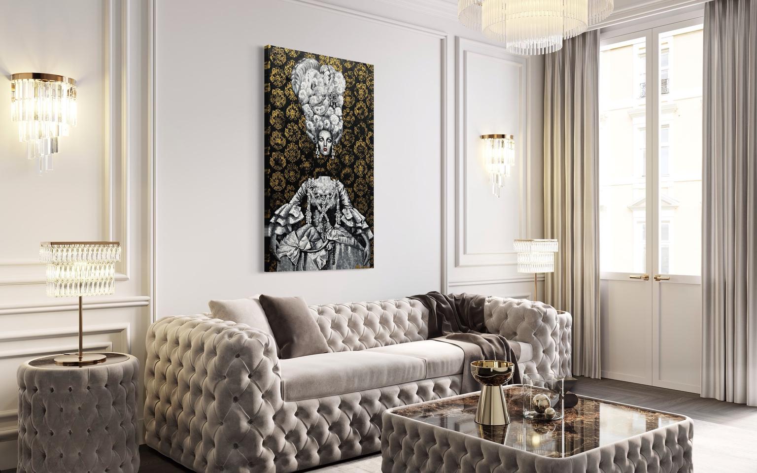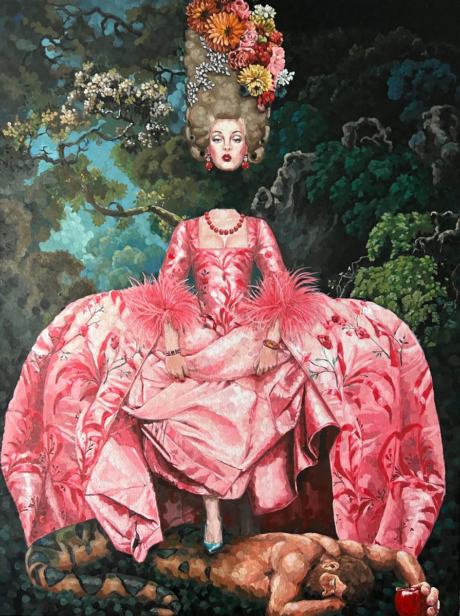 Oil, acrylic, wedding dress (curtains), and dried flowers on canvas 48″ x 36″ inch