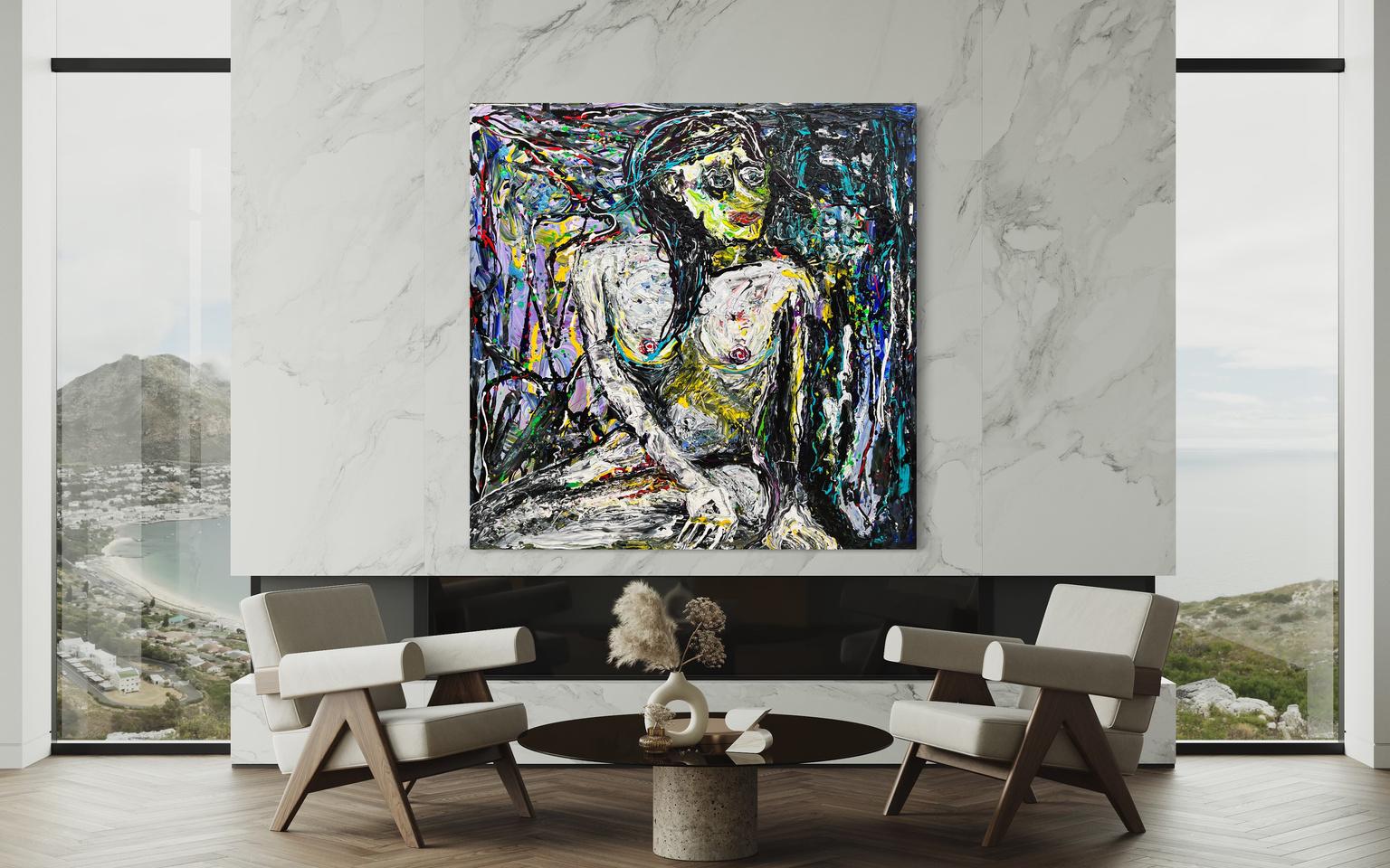 Artist Aaron Sheppard "Psyche's Abduction of Mercury" Ink, oil, acrylic, photo collage on paper 91" X 42"