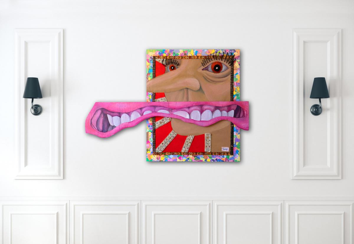 Acrylic, glitter, thread and fabric on canvas and paper mache 48″ x 44″ inch
