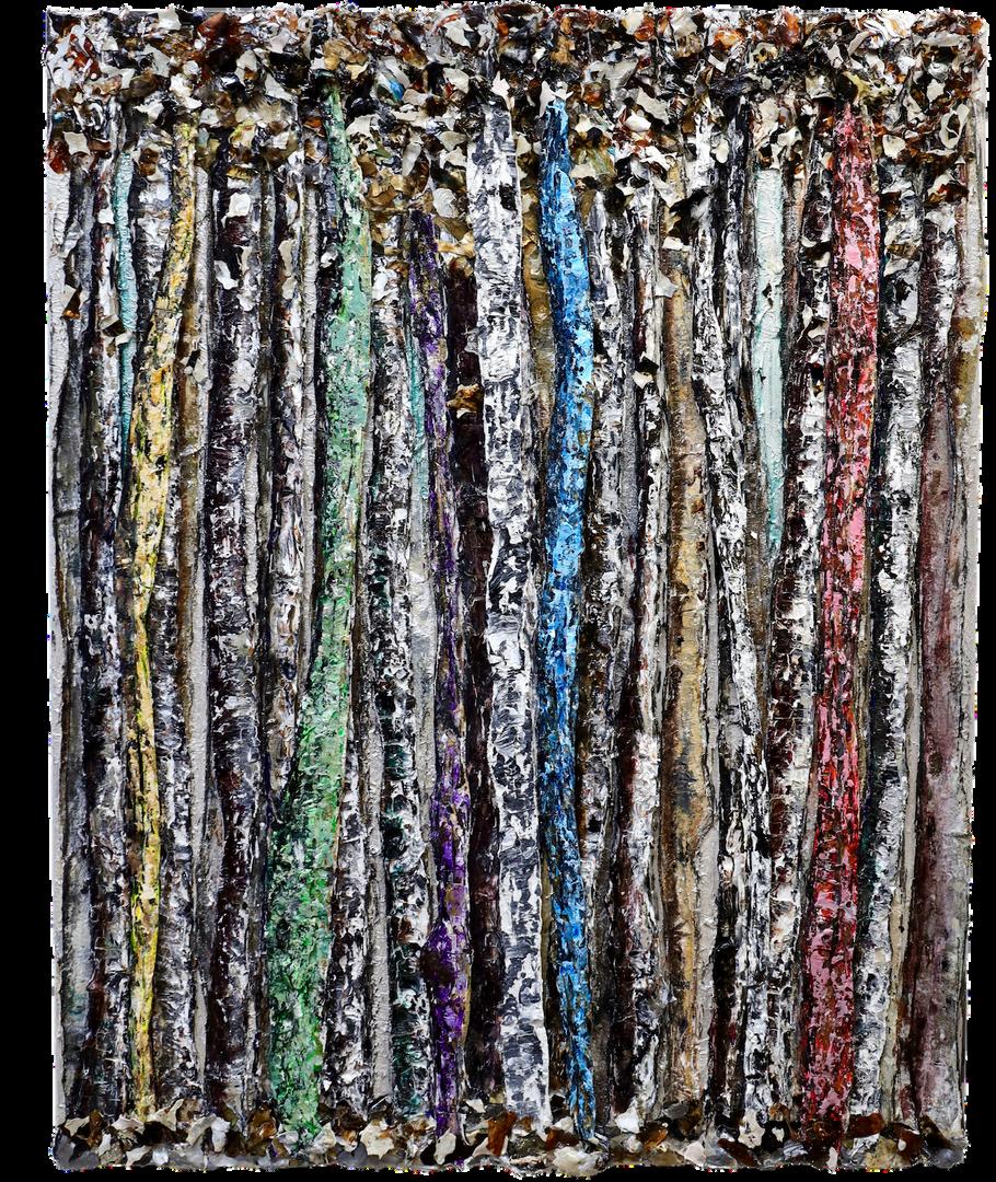 Mashian’s sculptural relief portrays colorful forests that are fully articulated and layered creating a visual phenomena that alternately appear in sharp relief or recede into the depth of landscape. She experimented with novel painting techniques and emphasized color, process, and materiality epitomizing the process of pure form emerging from raw material coalescing the ancient and modern in this series.